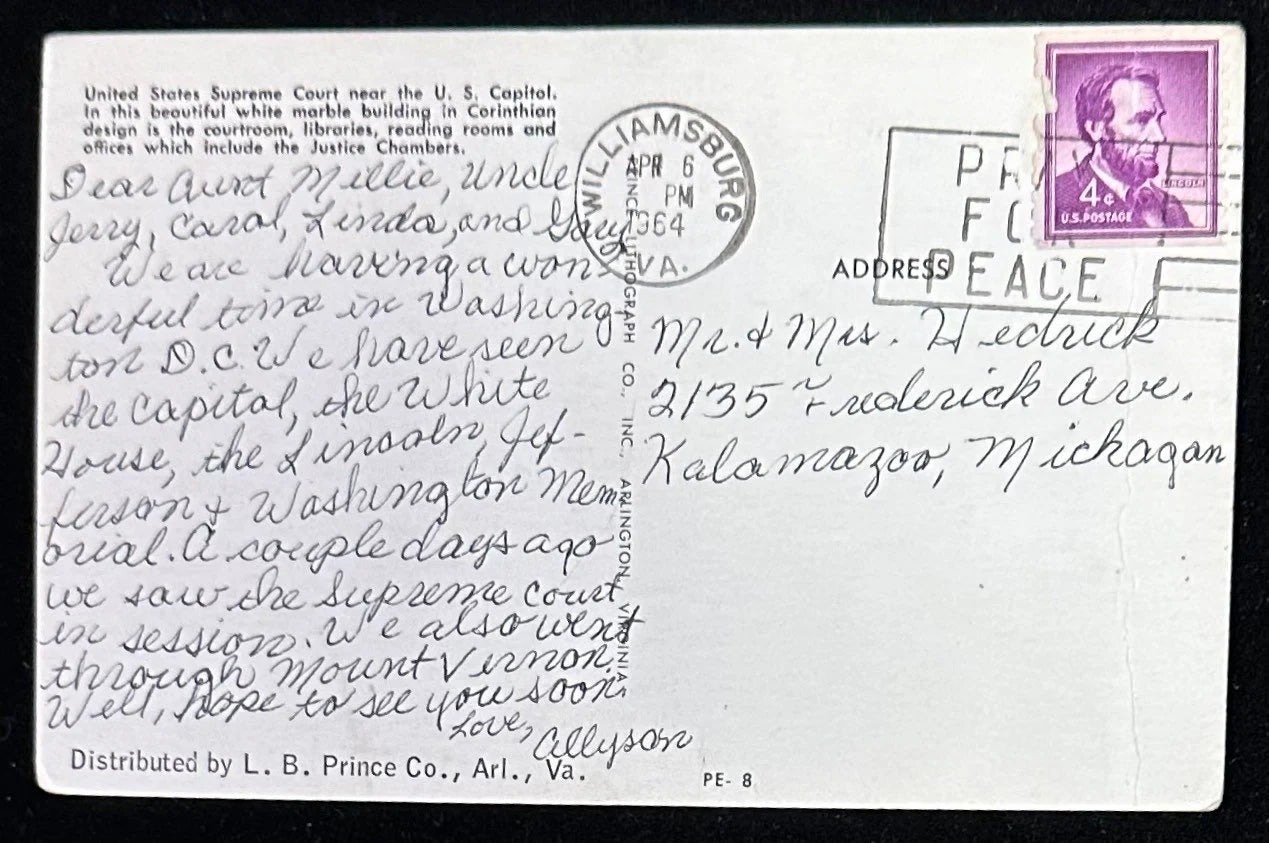Mailed: Posted on April 6th, 1964 from Williamsburg, Virginia with a lilac 4 cent Abraham Lincoln stamp