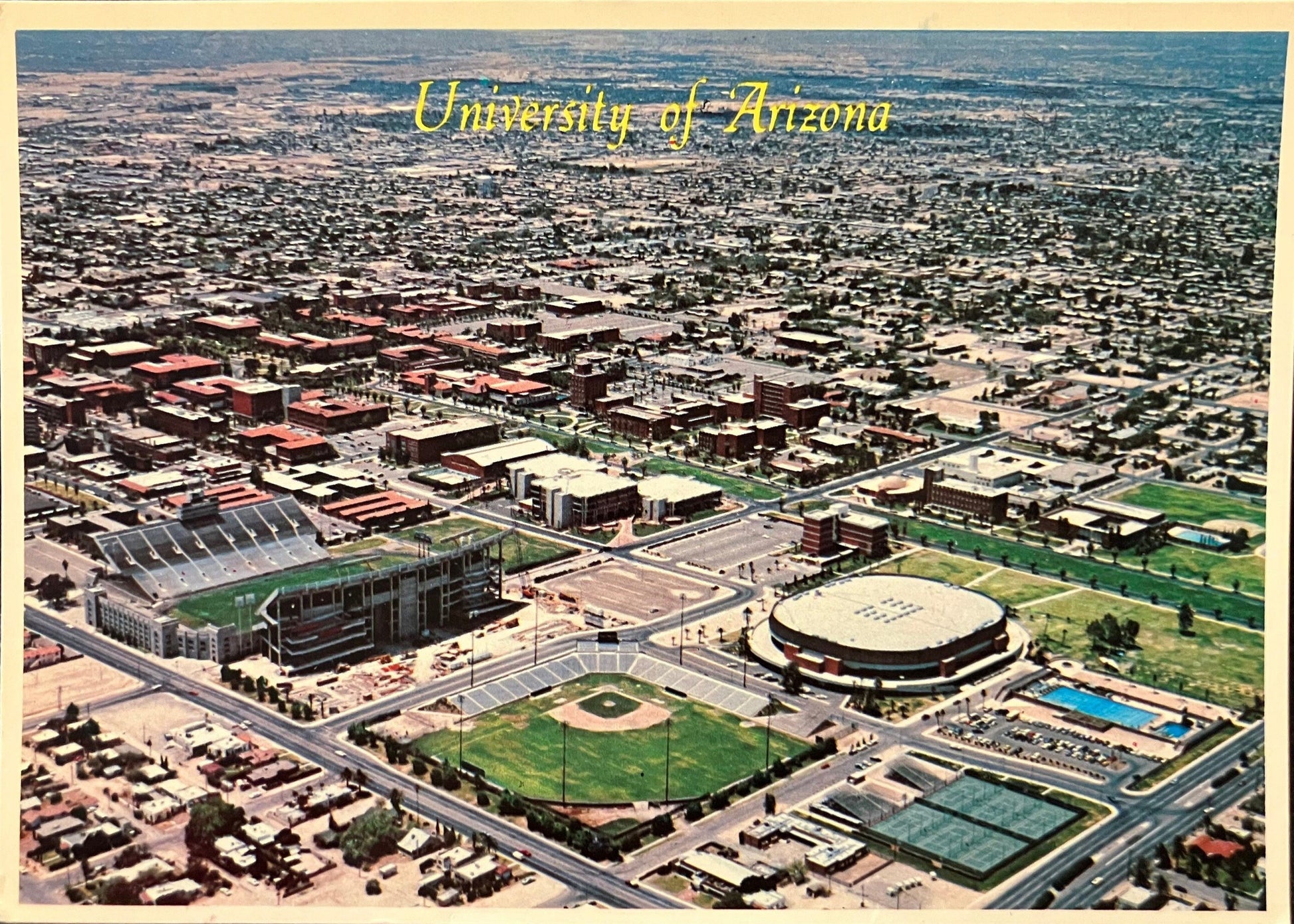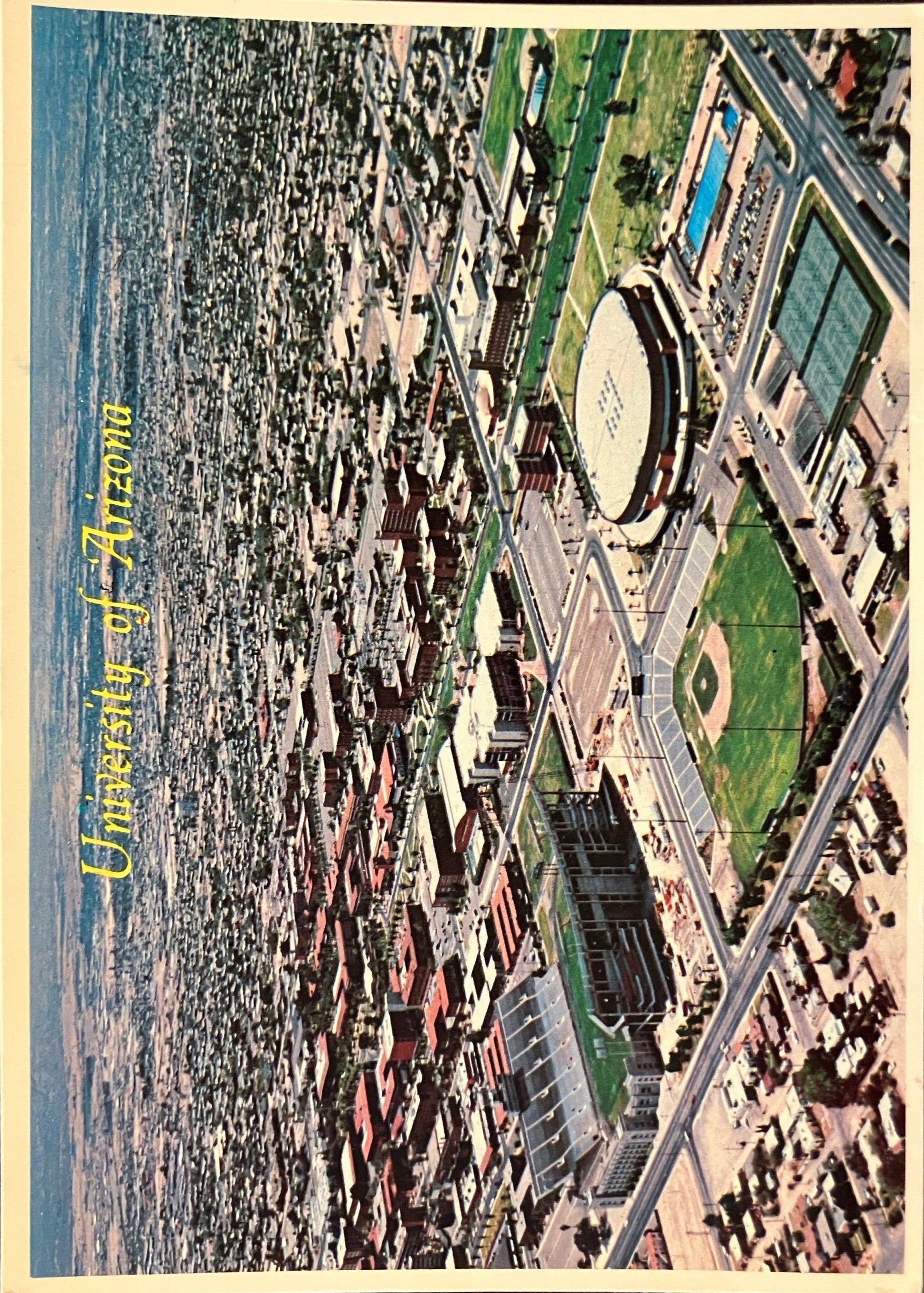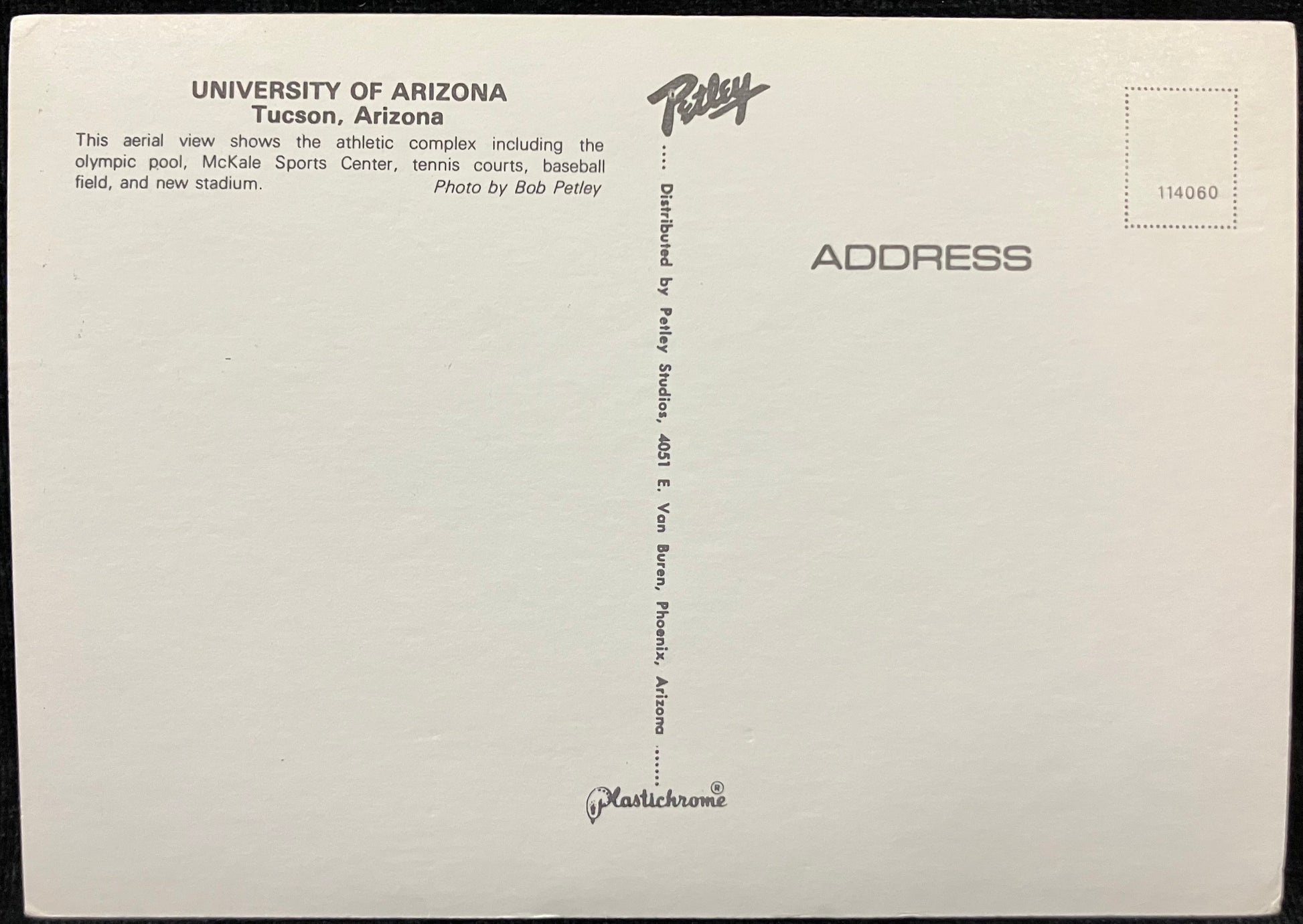 On back: UNIVERSITY OF ARIZONA Tucson, Arizona This aerial view shows the athletic complex including the Olympic pool, McKale Sports Center, tennis courts, baseball field and new stadium
