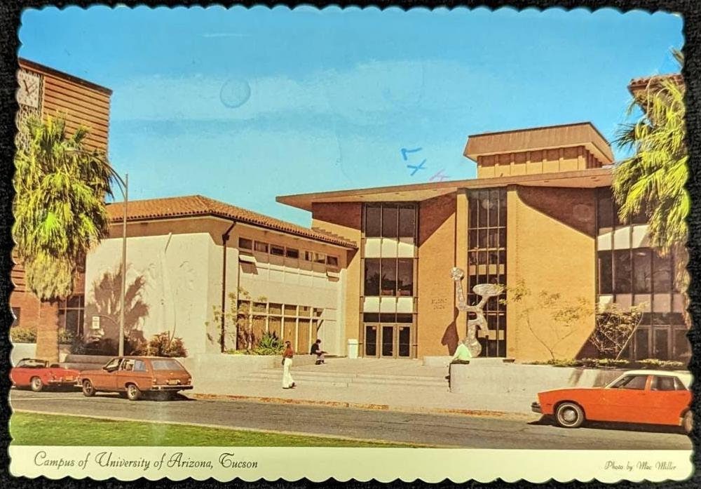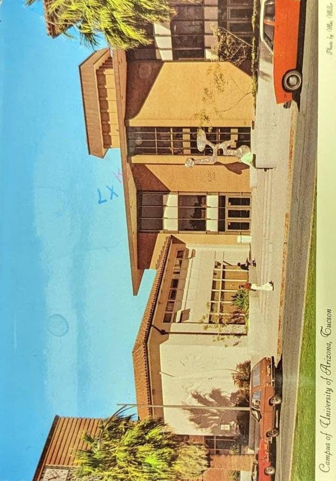 Back: "The Student Union Memorial Building | University of Arizona - Tucson | This building is the social hub of this beautiful 120 acre campus close to central Tucson. Its architectural style is typical of more than 68 buildings serving more than 25,000 students on this beautifully landscaped campus." Preceded by a handwritten note.