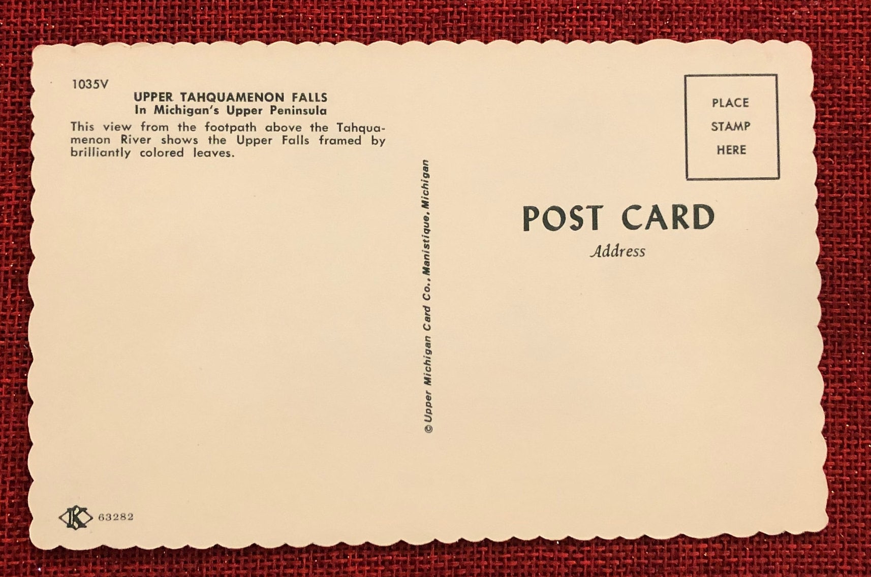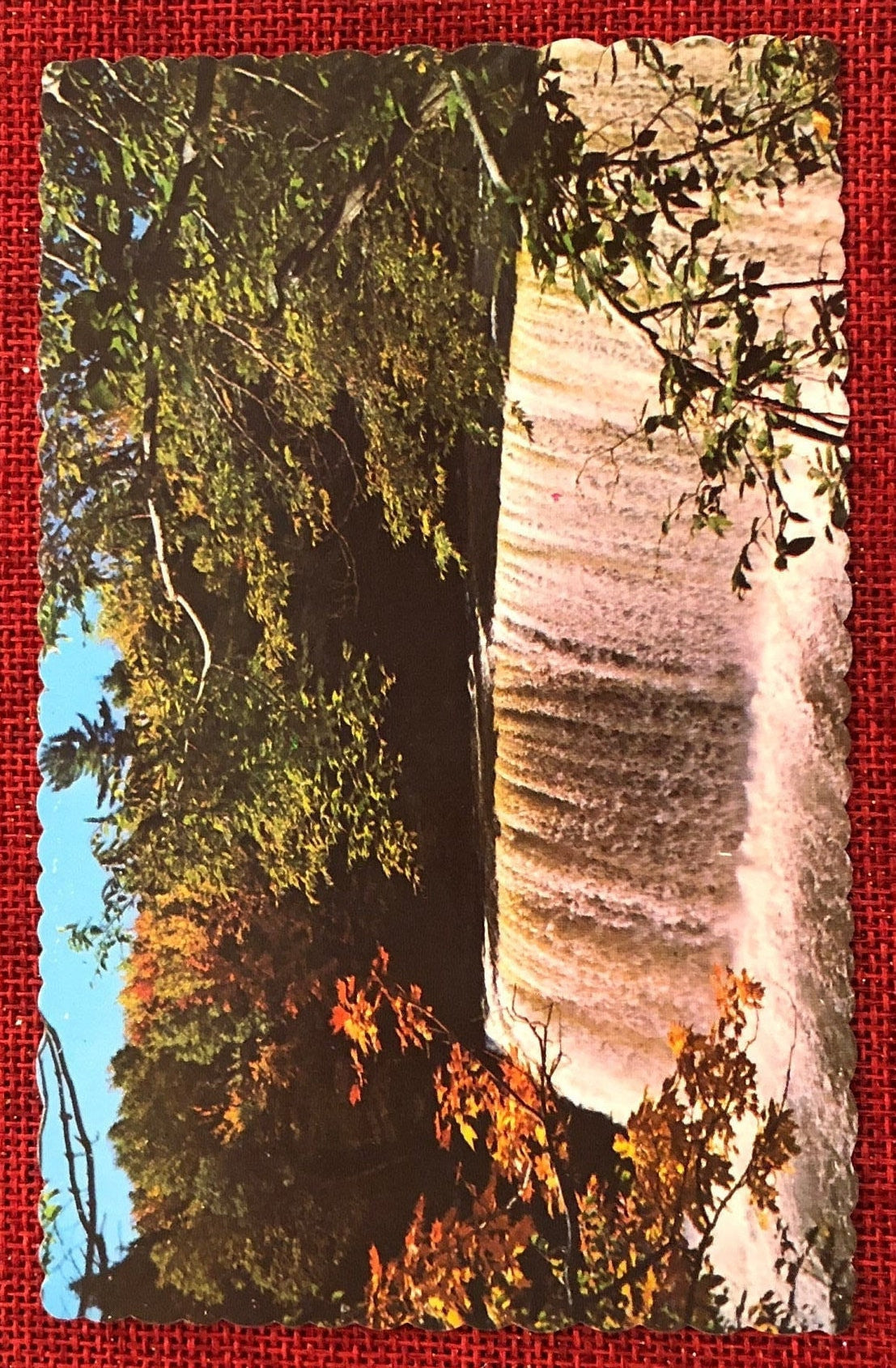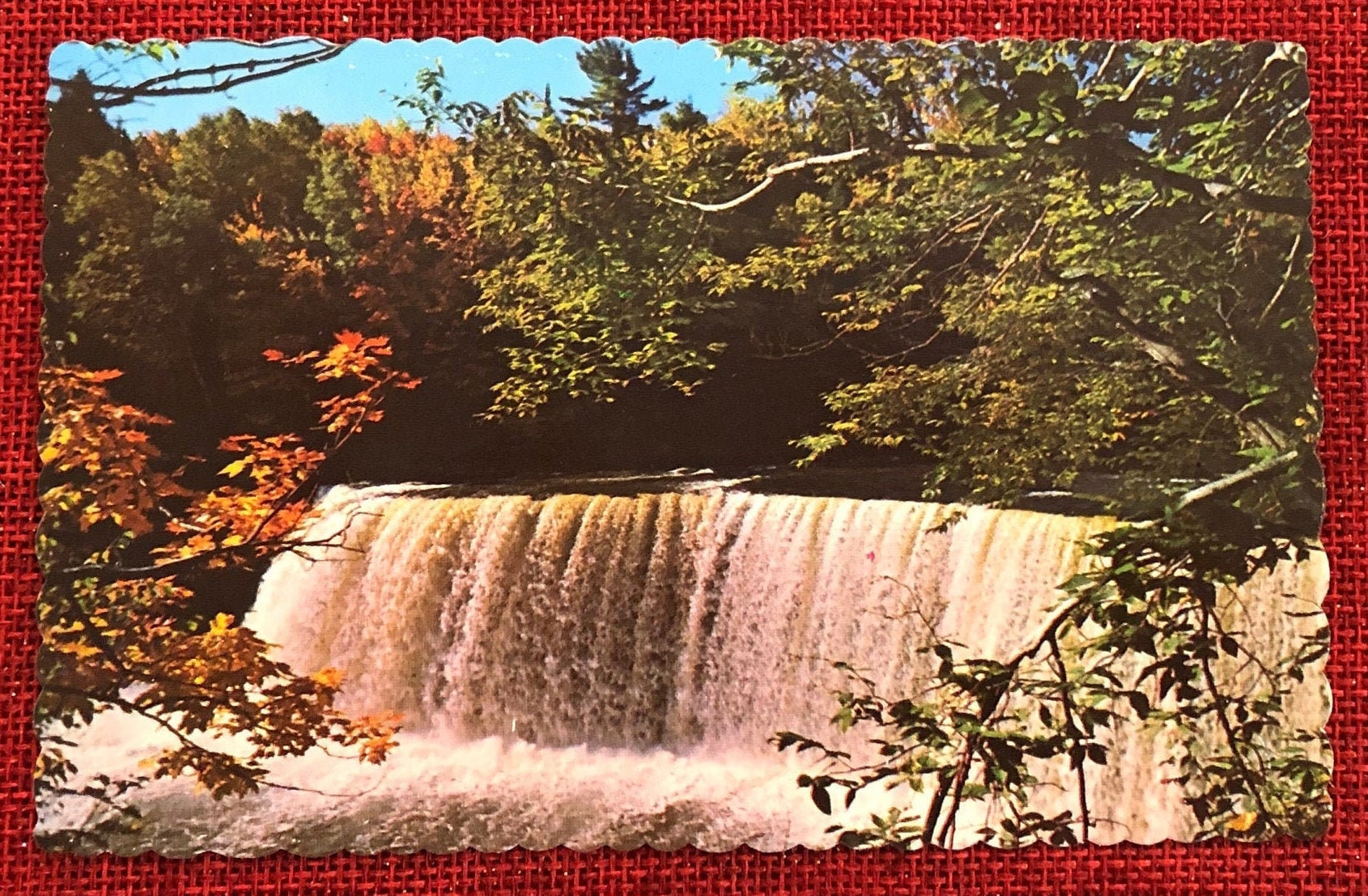 Front: This scallop edged postcard shows a scenery of early fall time at Tahquamenon Falls in the Upper Peninsula of Michigan. The golden color of the water shows beautifully as it drops the forty feet from the rim. It was produced in the 1950s in Manistique, Michigan.