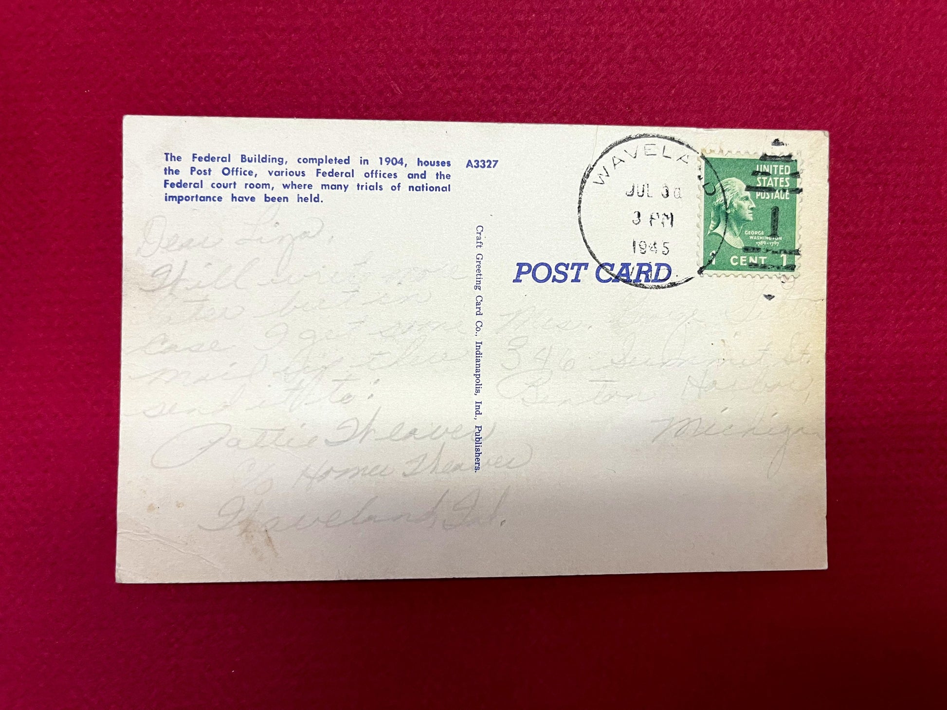 Featuring the Indianapolis, Indiana U.S. Post Office, this postcard has a small amounts of wear on the corners and has some ink residue on the front, as seen in the picture.