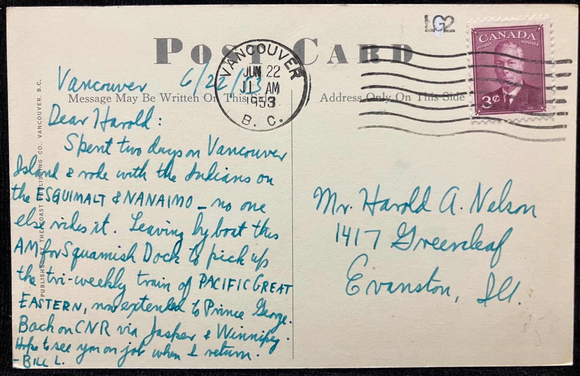 Mailed: Postmark 1953 purple three cent King Edward VI stamp