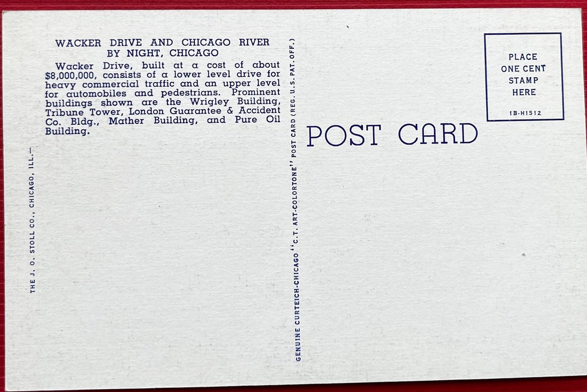 Back Text: "Wacker Drive and Chicago River by Night, Chicago. Wacker Drive, built at a cost of about $8,000,000, consists of a lower level drive for heavy commercial traffic and an upper level for automobiles and pedestrians. Prominent buildings shown are the Wrigley Building, Tribune Tower, London Guarantee & Accident Co. Bldg., Mather Building, and Pure Oil Building."