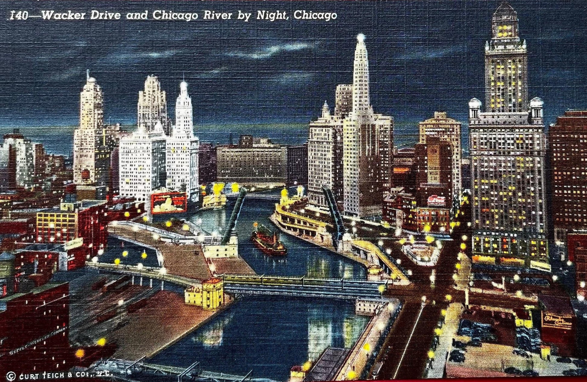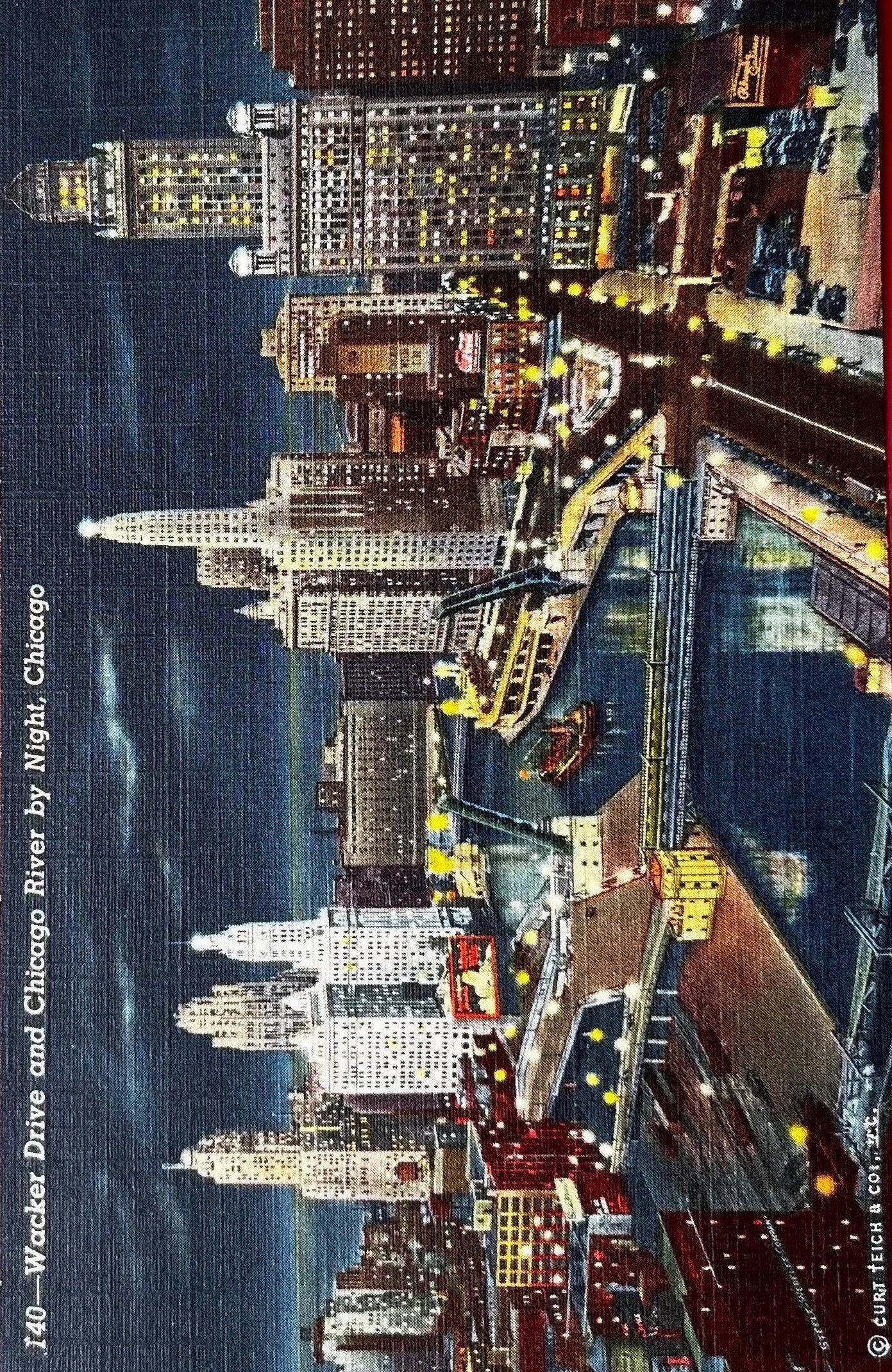 A beautiful linen postcard over the Chicago River showing the night life. The road depicted, Wacker Drive, is a major multilevel street for automobile and pedestrian traffic. Many popular buildings are also shown, such as the Tribune Tower and Wrigley Building shining brightly during the night.