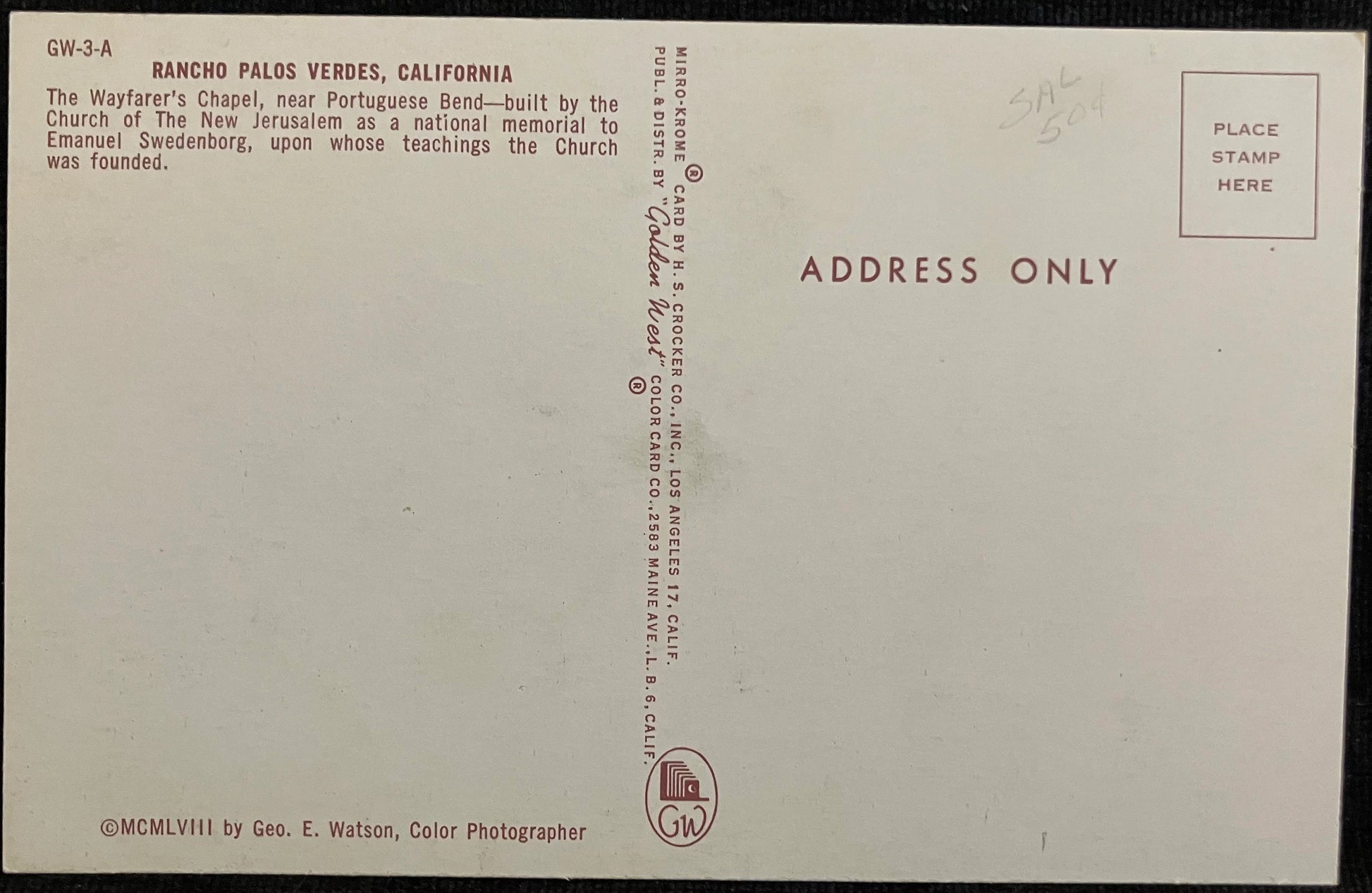 Back: RANCHO PALOS VERDES, CALIFORNIA The Wayfare’s Chapel, near Portugese Bend - built by the Church of The New Jerusalem as a national memorial to the Emanuel Swedenborg, upon whose teaching the Church was founded.