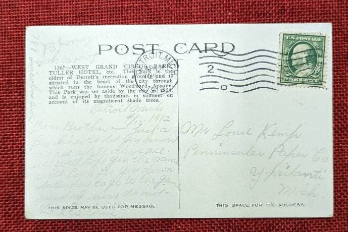 The park is Detroit's oldest recreation ground situated in the heart of the city. It was created in 1854. You can see the early Detroit skyline was evolving in the back ground. The card was mailed and has a postmark of 1912. It is in very nice condition.