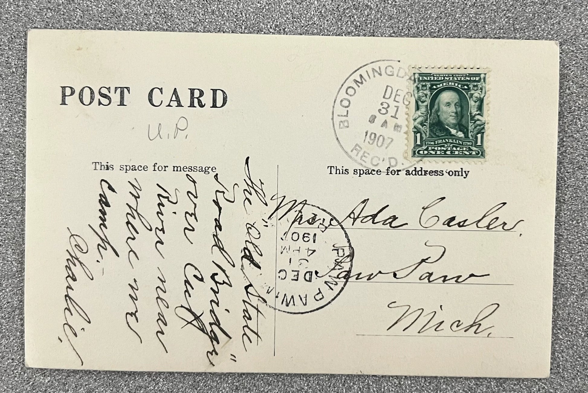 Mailed on Dec. 31, 1907, from Paw Paw, Michigan, with a green one-cent George Washington stamp.