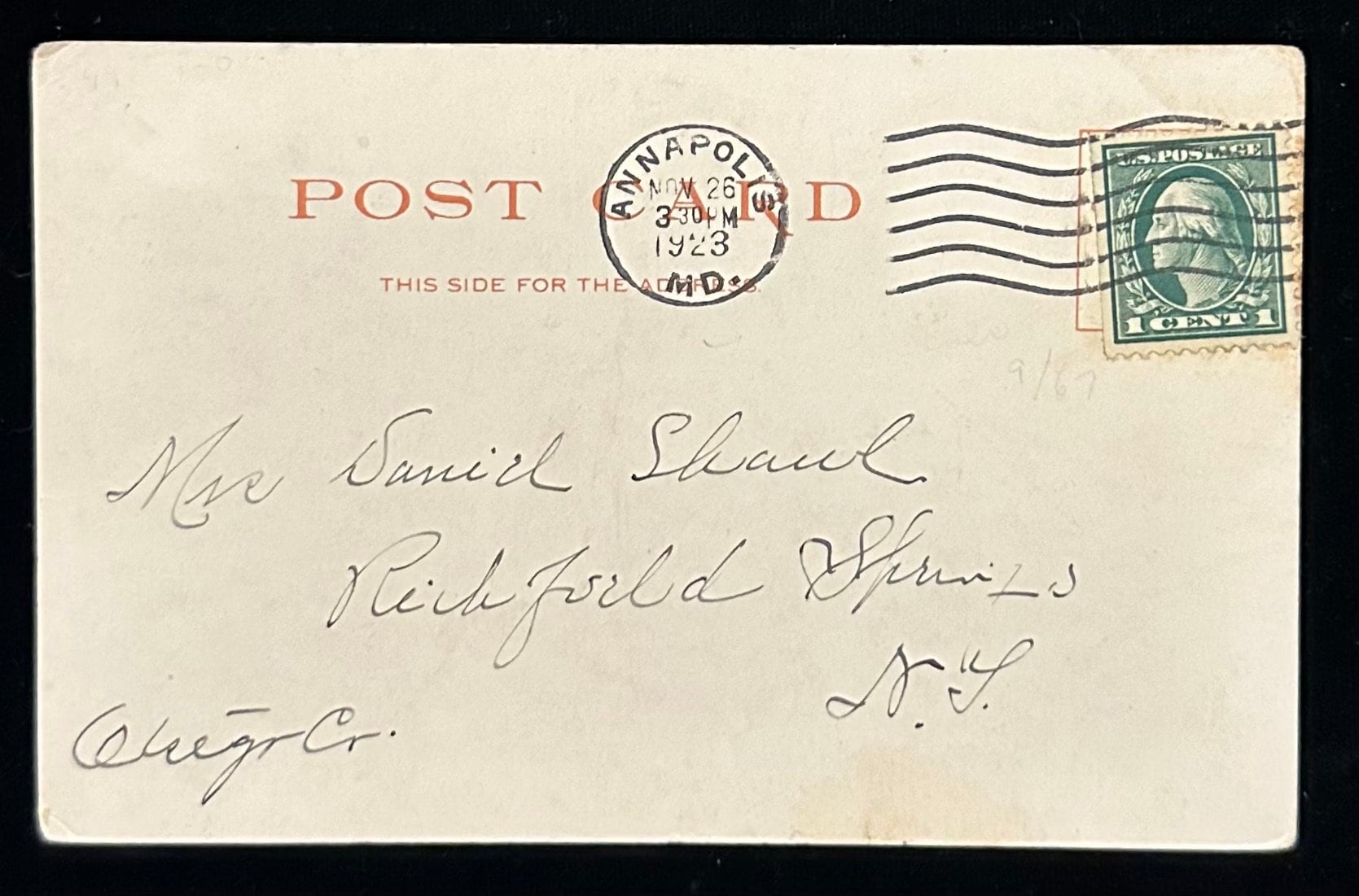 Mailed: Posted on November 26th, 1923 from Annapolis, MD. with a green 1-cent George Washington stamp