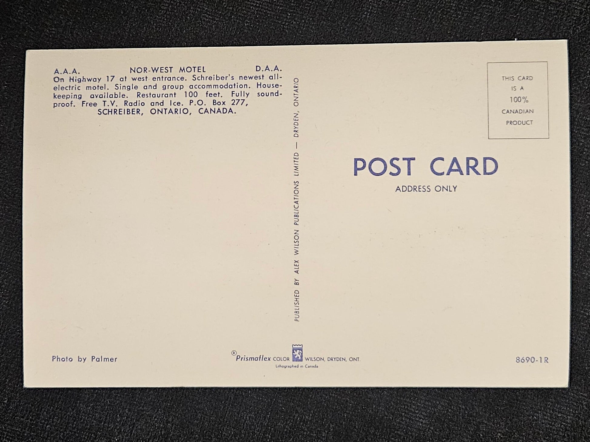 Back: Nor-West Motel. On Highway 17 at west entrance. Schreiber’s west all-electric motel. Single and group accommodation. Housekeeping available. Restaurant 100 feet, fully soundproof. Free T.V., radio and ice. P.O. Box 277, Schreiber, Ontario, Canada.