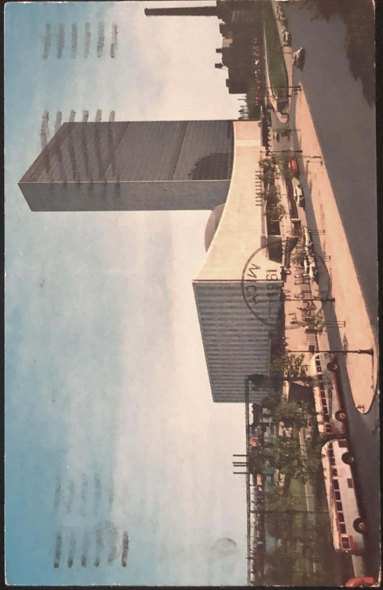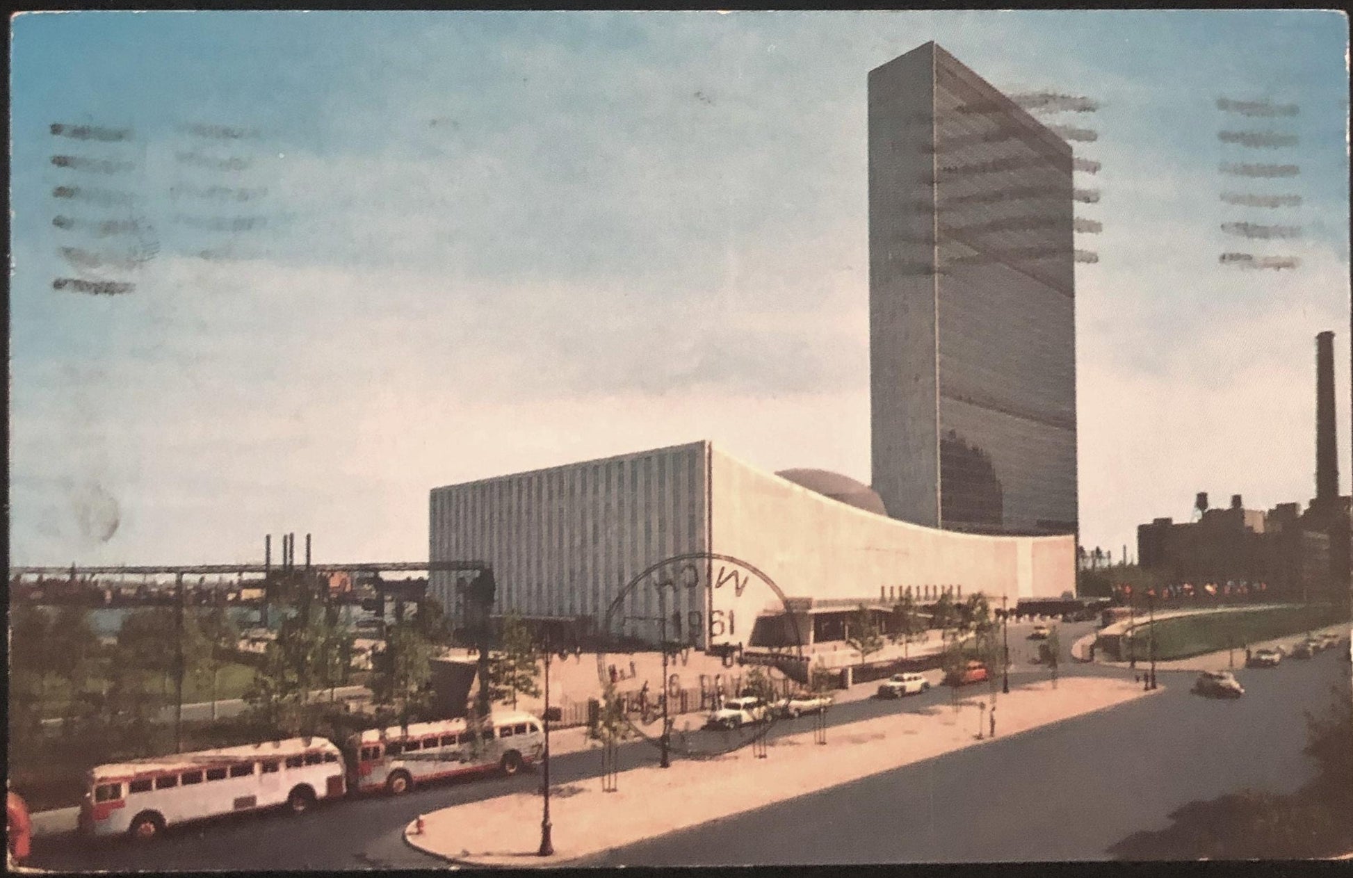 Back information: Over an 18-acres tract between 42nd and 48th Streets and First Avenue, with East River in left background.