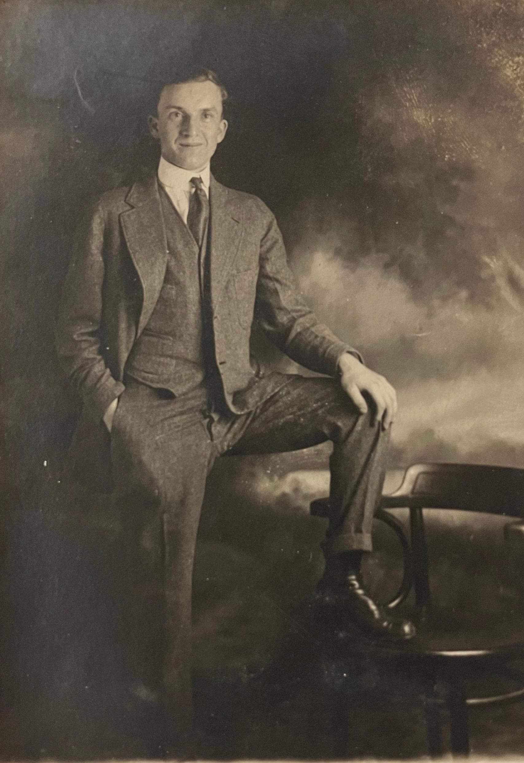 On front: A photo of a man striking a pose with a chair