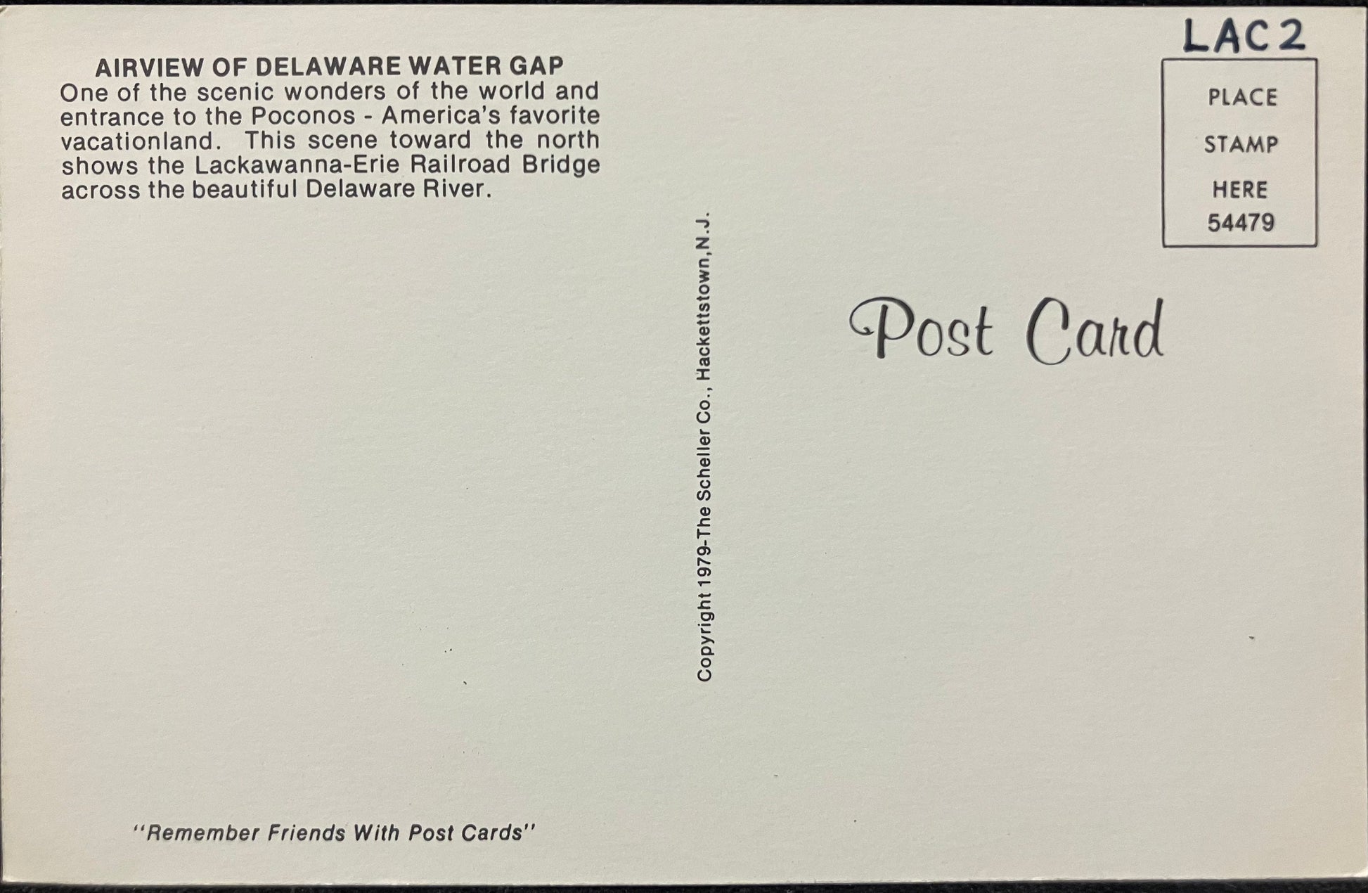 Back: AIRVIEW OF DELAWARE WATER GAP One of the scenic wonders of the world and entrance to the Poconos - America's favorite vacationland. This scene toward the north shows the Lackawana-Erie Railroad Bridge across the beautiful Delaware River. "Remember Friends With Post Cards"