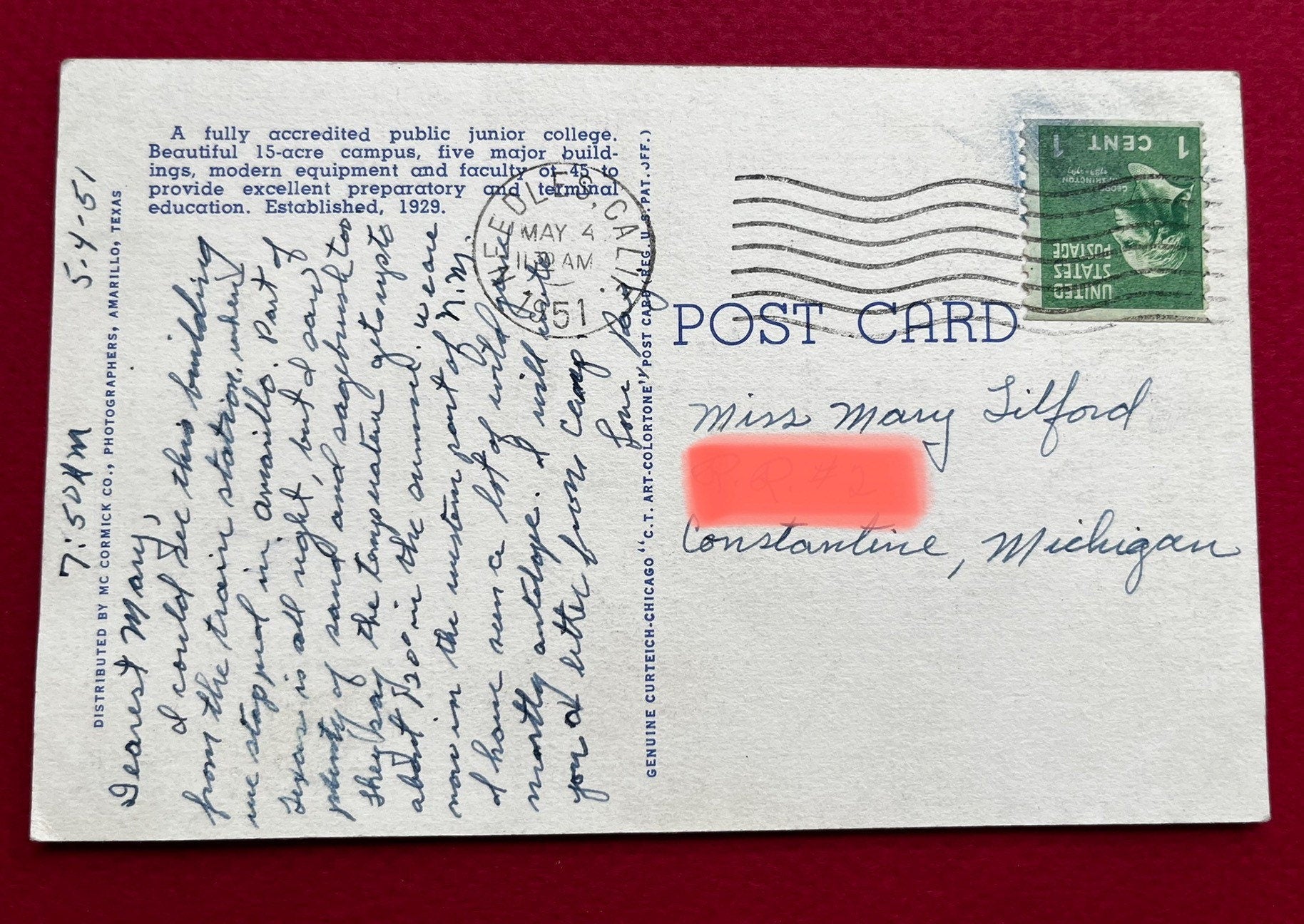Postmarked: May 4, 1951 - Needles, CA