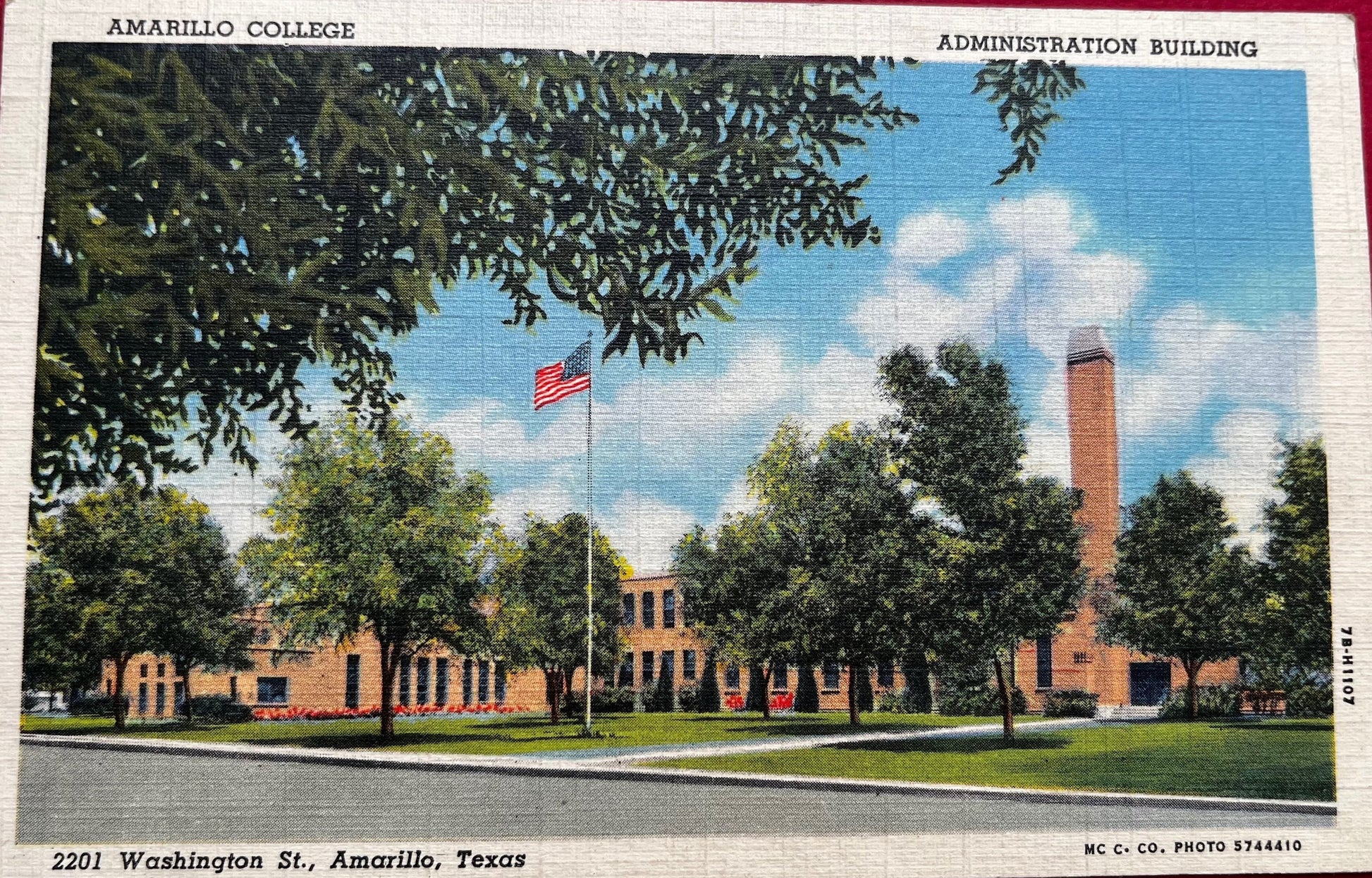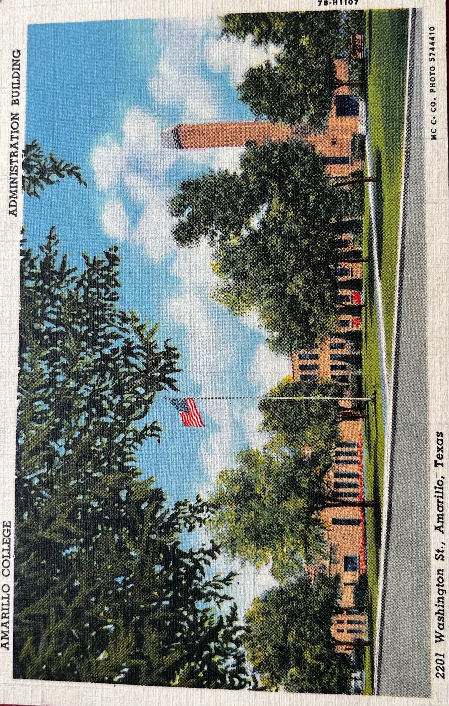 This postcard features the Amarillo College Administration Building with the American flag waving proudly in the green. A genuine Curteich-Chocago "C.T. Art-Colortone" postcard distributed by Mc Cormick Co., Photographers, Amarillo, Texas.