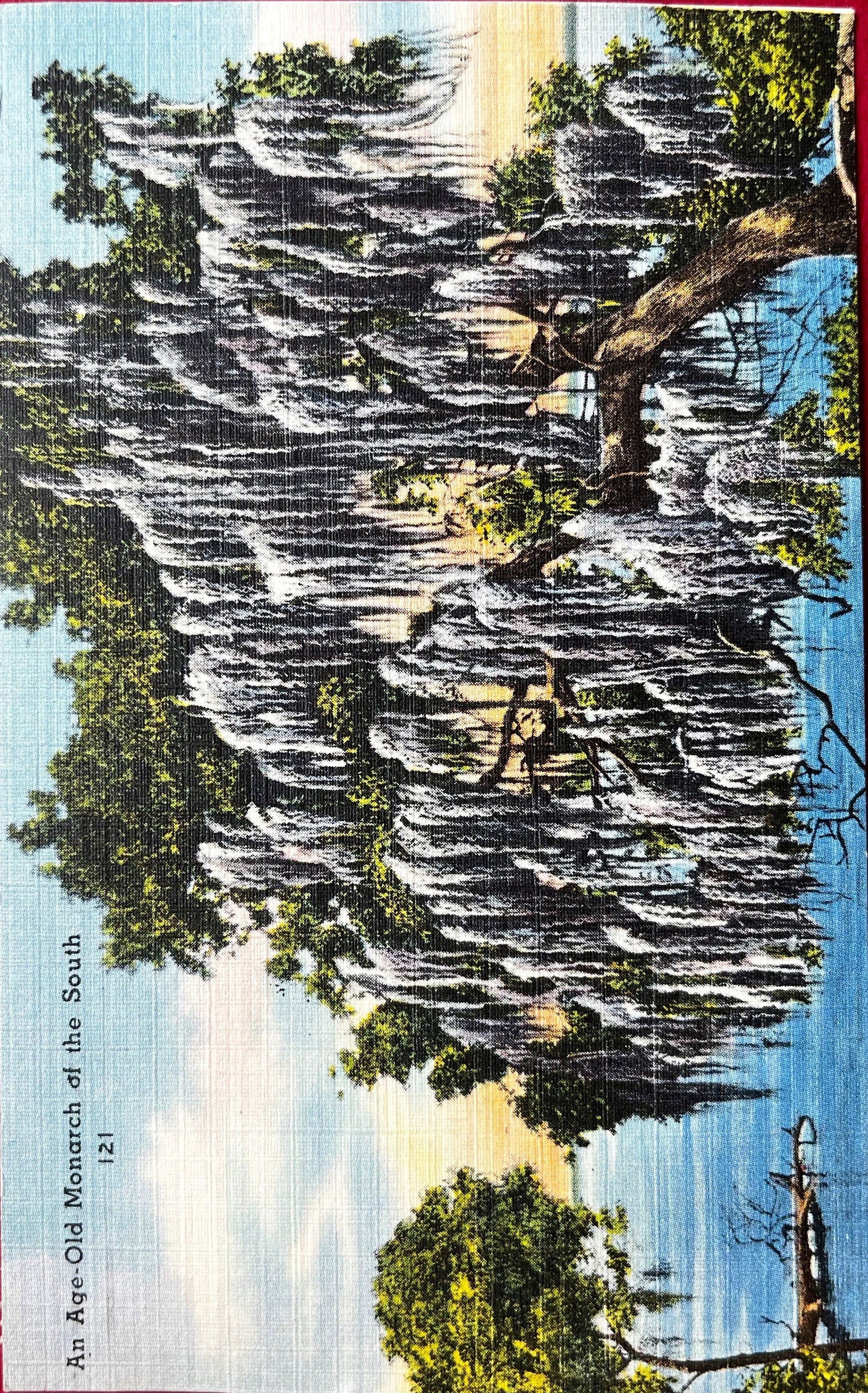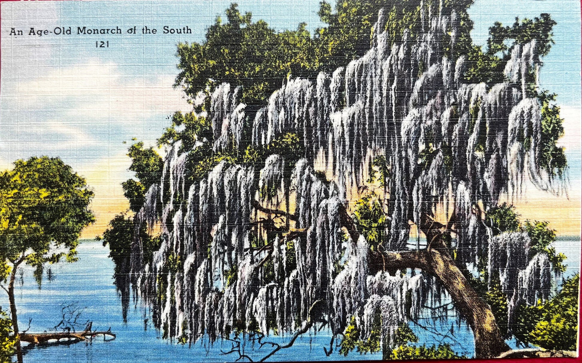 This "Tichnor Quality Views" postcard features an age-old Monarch of the south. Covered in Spanish Moss and branching out over the water, this tree has seen many years and the postcard captures that.