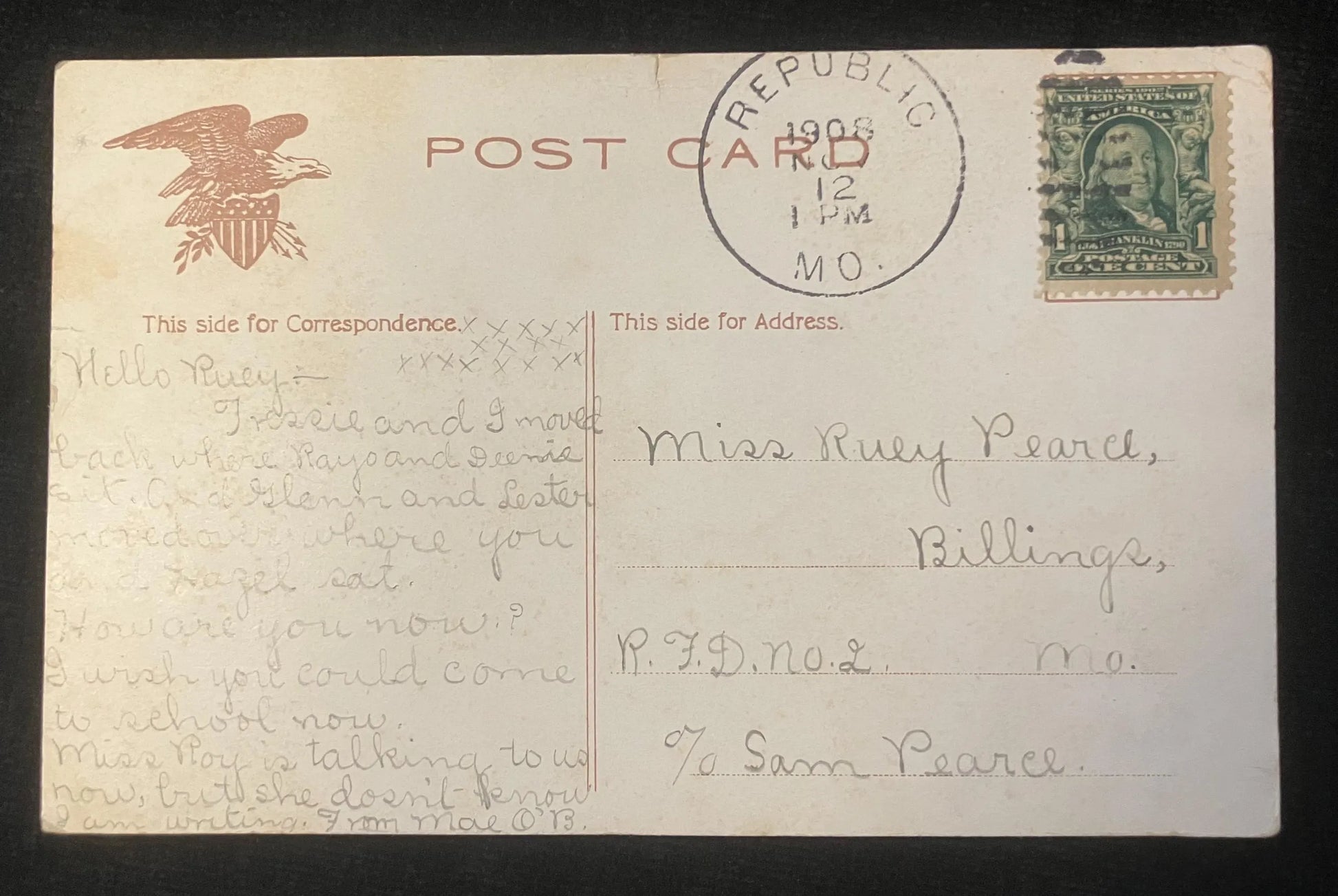 Mailed: Postmark: 1908 green one-cent Benjamin Franklin stamp