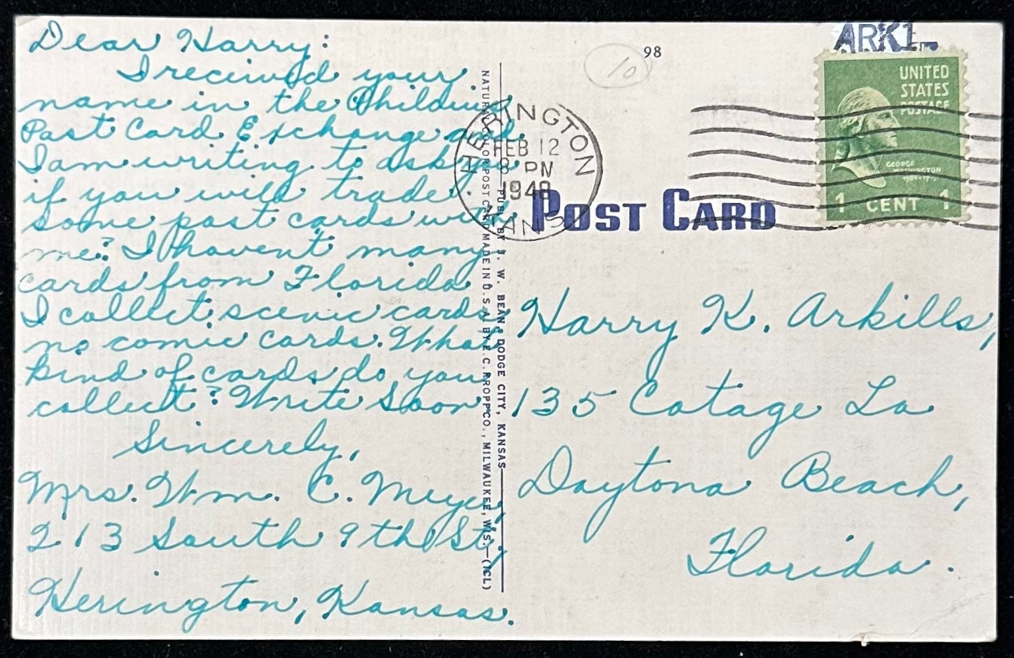 Mailed: Posted on February 12, 1949 from Herrington, Kansas with a green 1 cent George Washington stamp