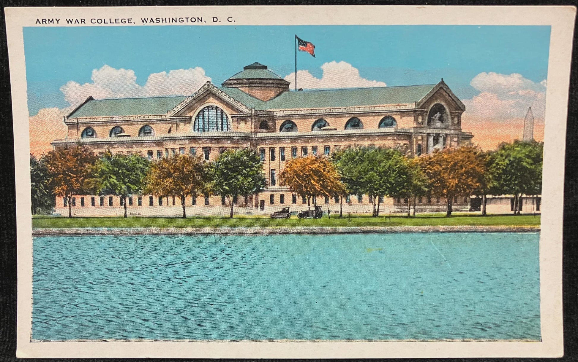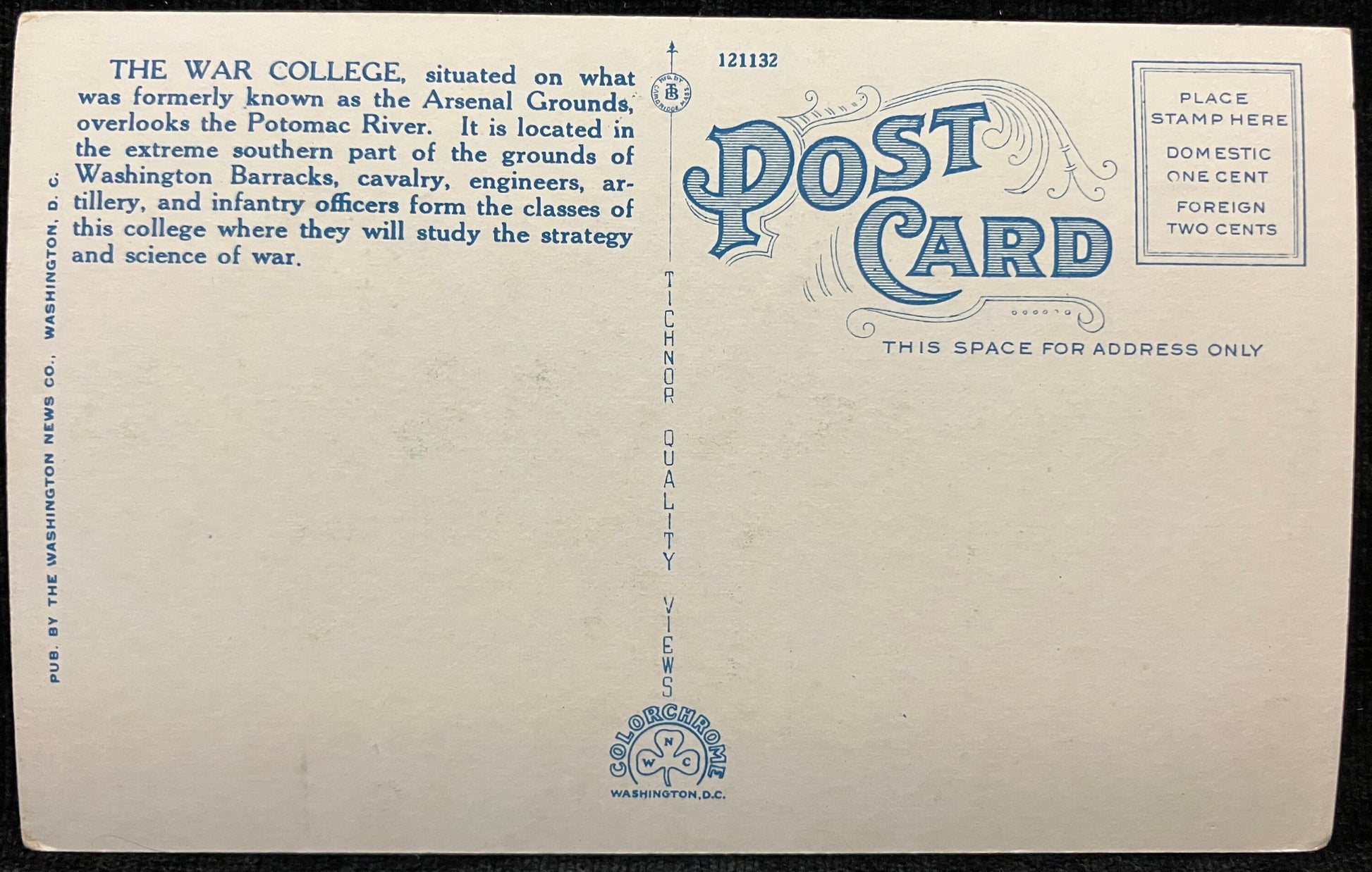 Back: THE WAR COLLEGE, situated on what was formerly known as the Arsenal Grounds, overlooks the Potomac River. It is located the extreme southern part of the grounds of Washington Barracks, cavalry, engineers, artillery, and infantry officers form the classes of this college where they will study the strategy and science of war.