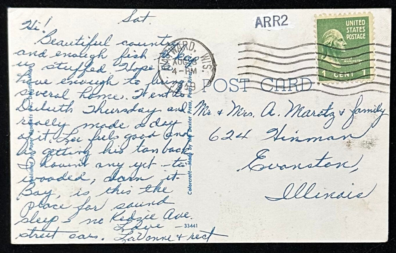 Mailed: Posted on August 8, 1949, from Hayward, Wisconsin, with a Green 1-cent George Washington