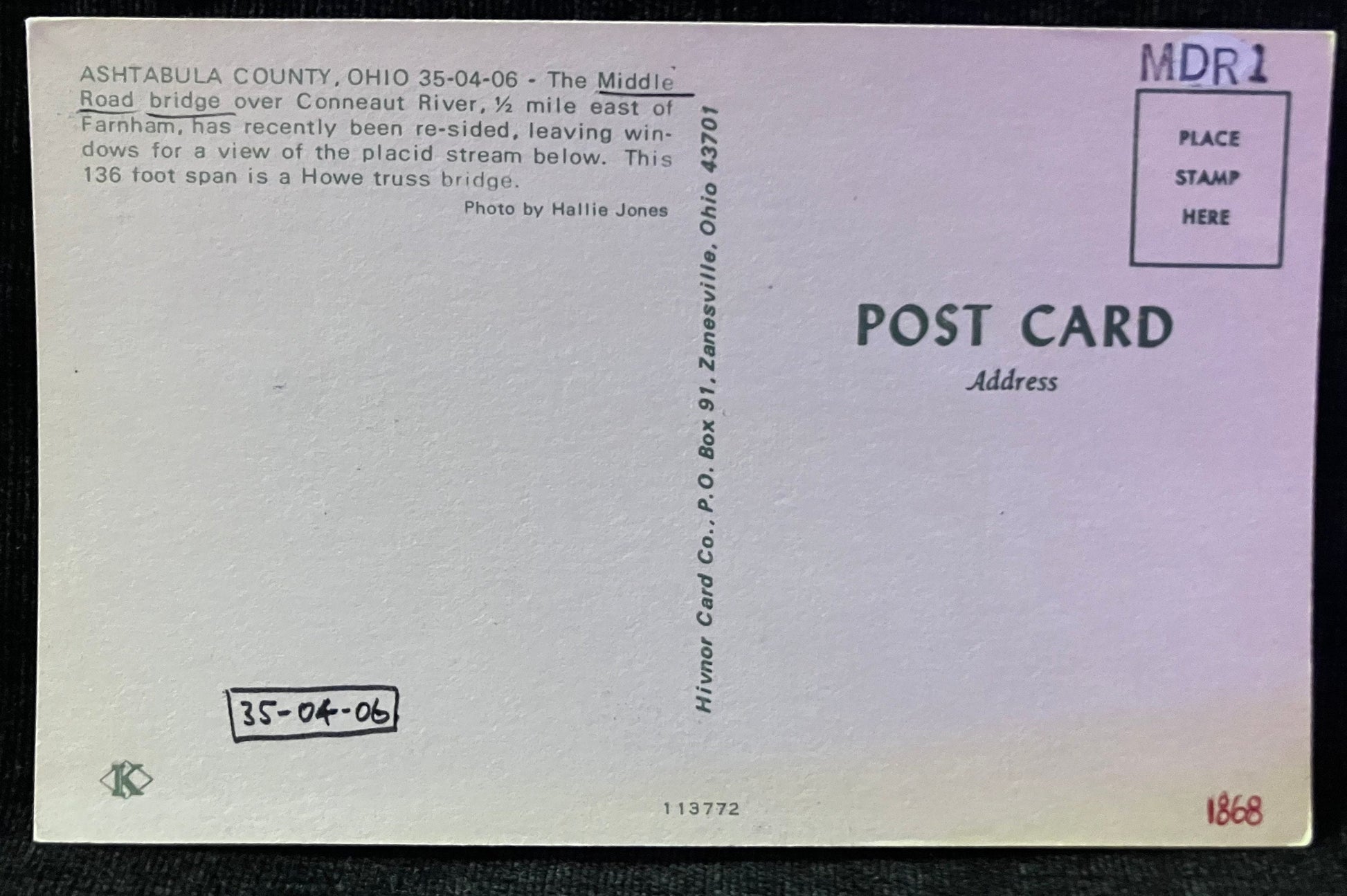 On front: A photo of the The Middle Road bridge over Connecticut River in Ashtabula County, Ohio