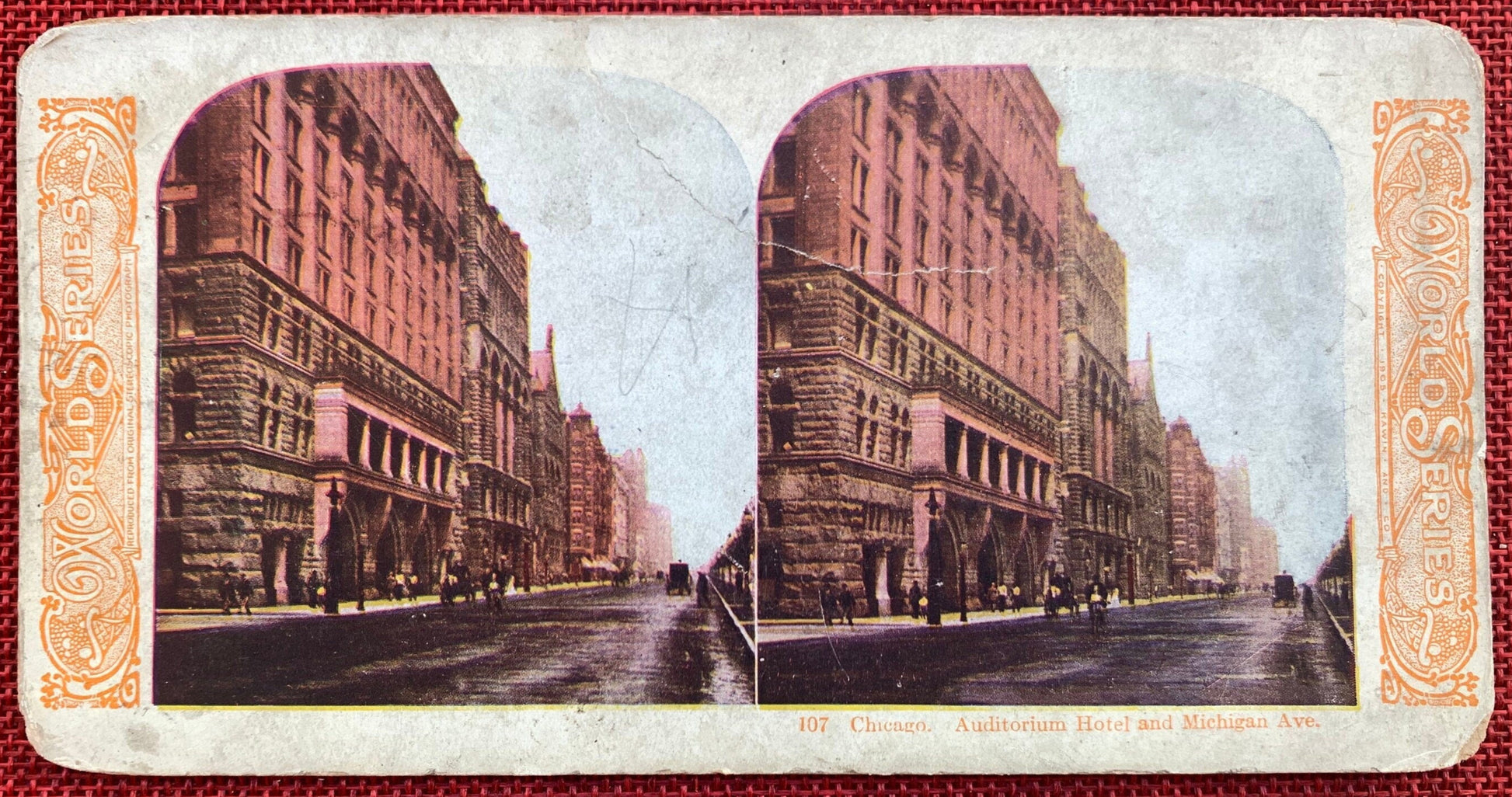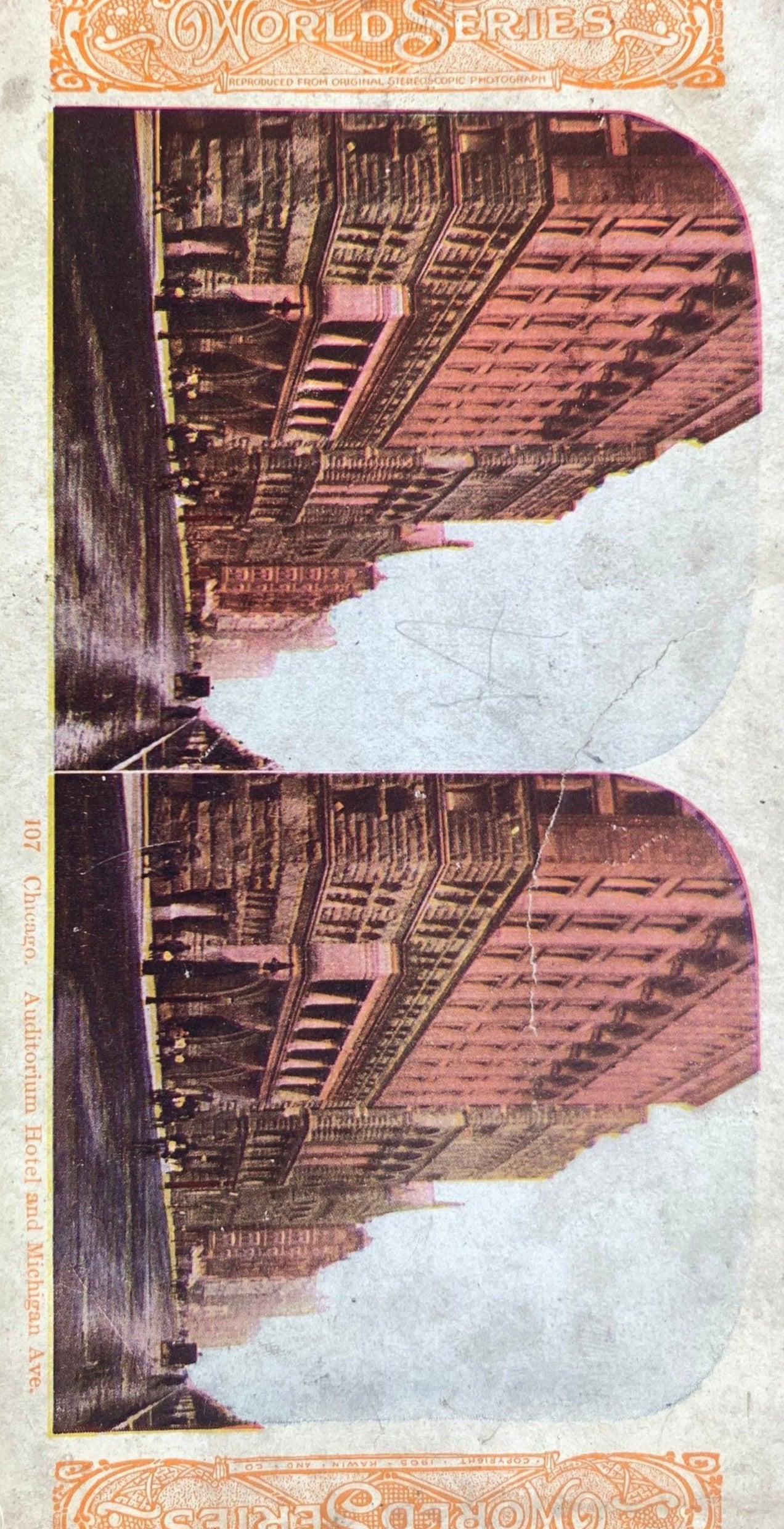 This vintage stereo card features two hand tinted images of the Auditorium Hotel and Michigan Avenue in Chicago, Illinois. There is a pencil mark on the front as well as a crack from being slightly bent. Because both of these damages are in the upper portion of the card (the building and the sky) the three dimensionality of the traffic and the street is not impacted. There are also a number of pencil scribbles on the back - looks like someone was practicing their cursive handwriting!