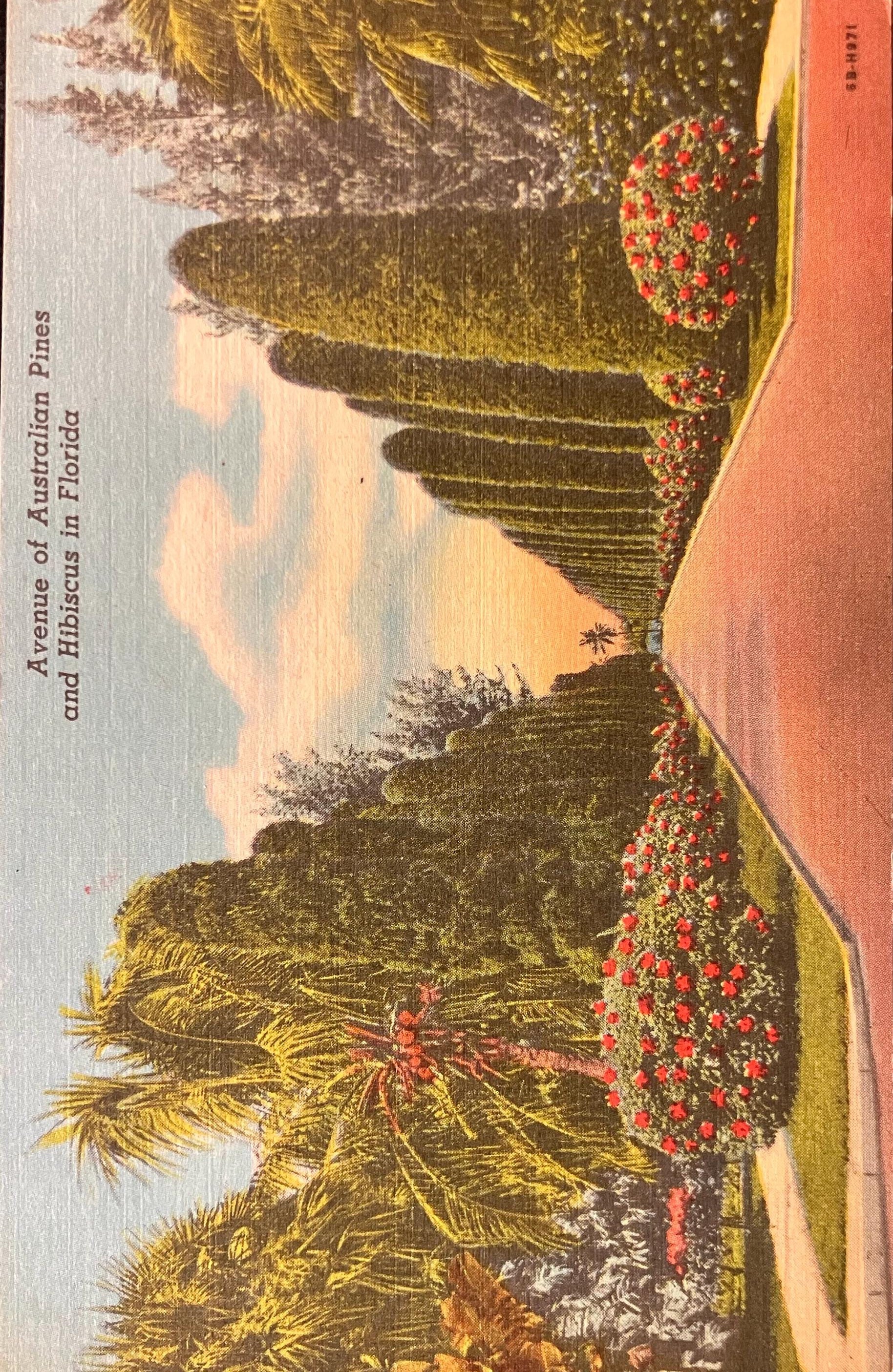 Avenue of Australian Pines and Hibiscus in Florida - Linen Postcard