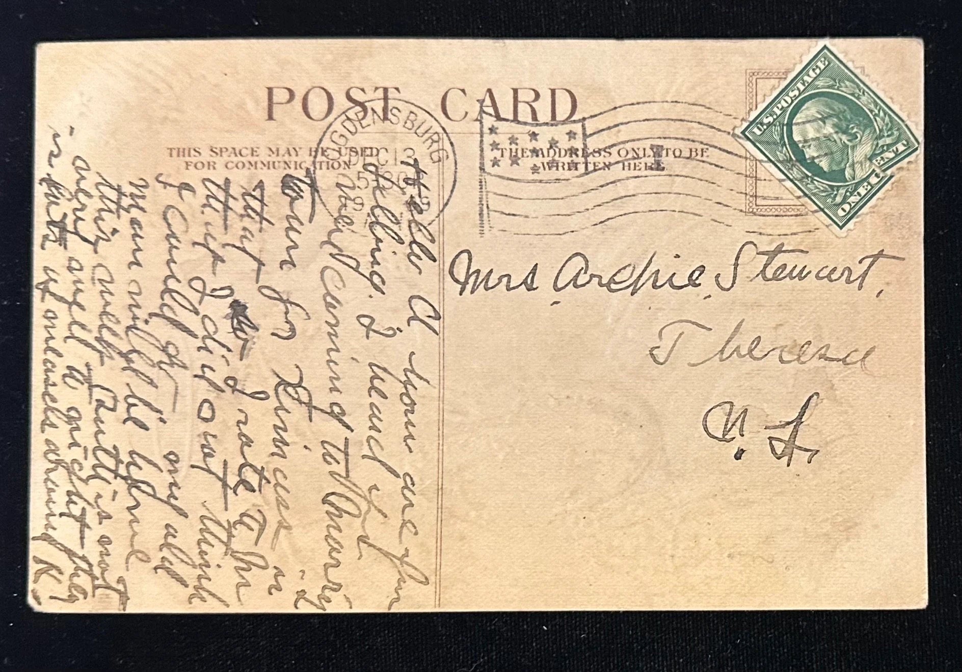Mailed: Posted on December 13th, 1909, from Ogdensburg, New Yor,k with a green 1-cent Ben Franklin stamp