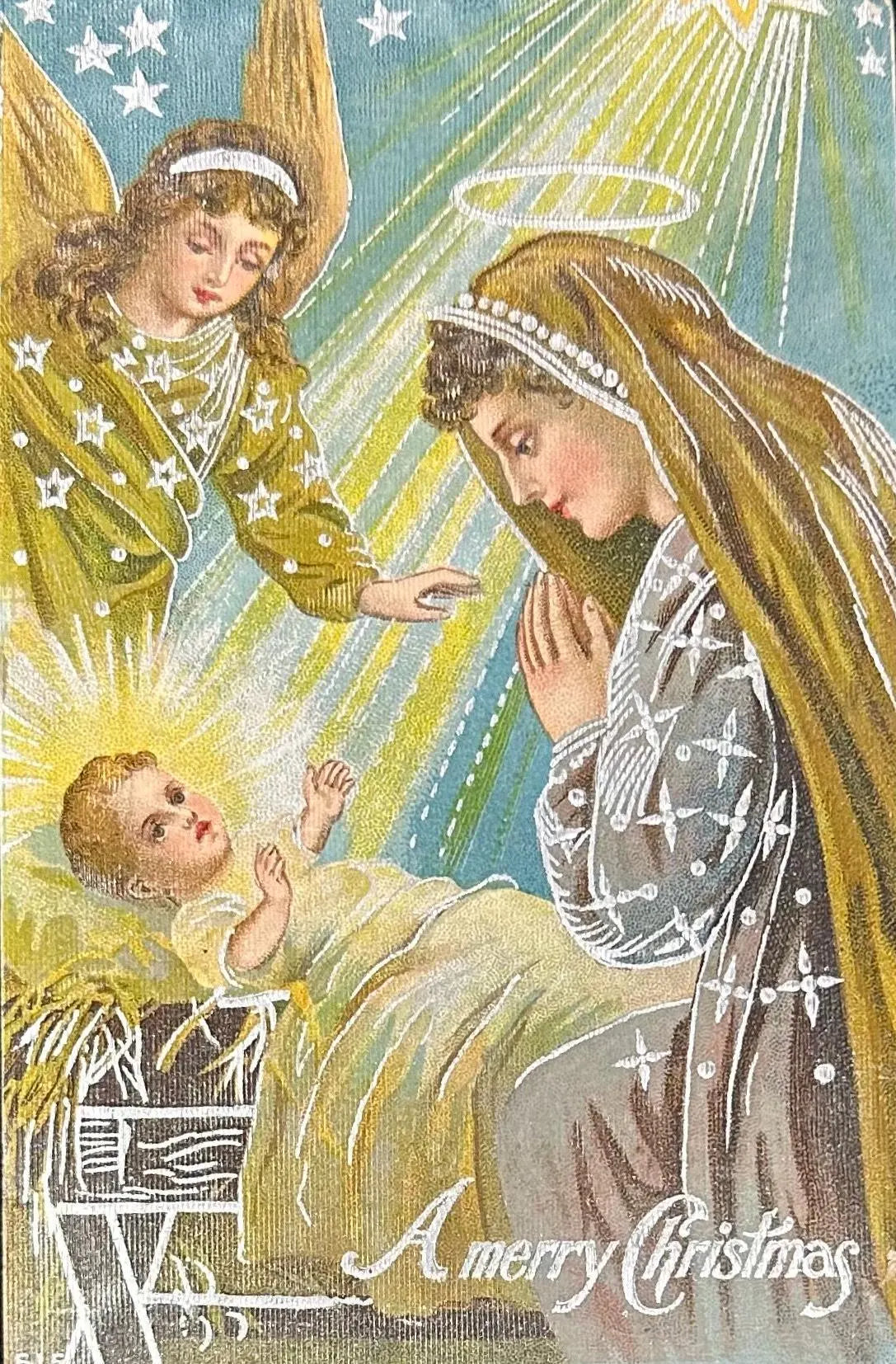 Baby Jesus and Prayer with Mary & Angels - A Merry Christmas - Vintage Postcard 1909