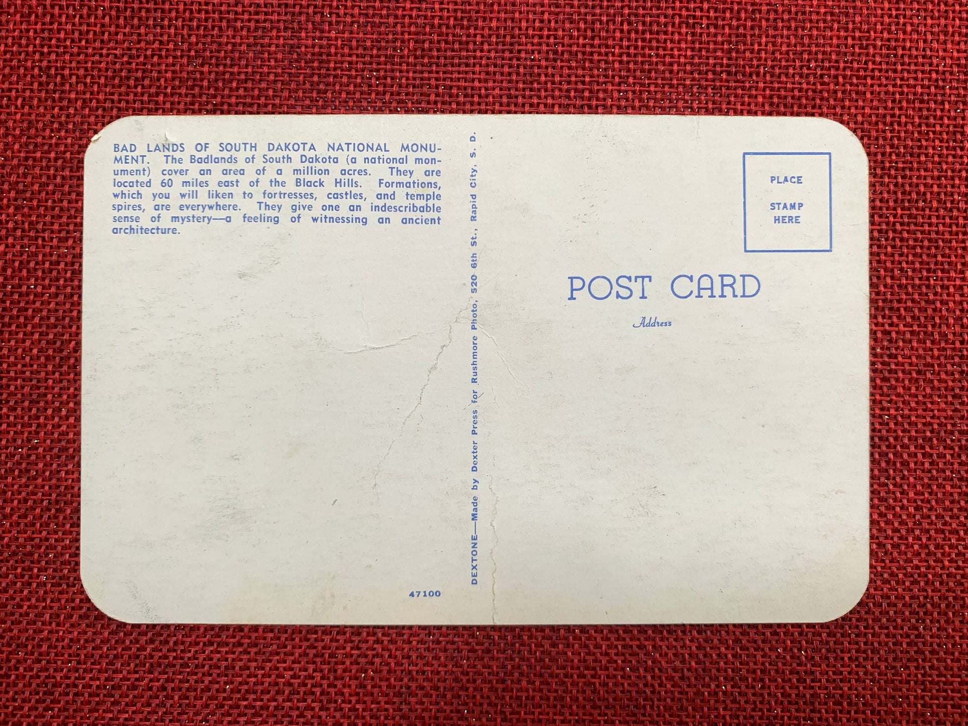 Back Text: "BAD LANDS OF South Dakota NATIONAL MONUMENT. The Badlands of South Dakota (a national monument) cover an area of a million acres. They are located 60 miles east of the Black Hills. Formations, which you will liken to fortresses, castles, and temple spires, are everywhere. They give one an indescribable sense of mystery – a felling of witnessing an ancient architecture."