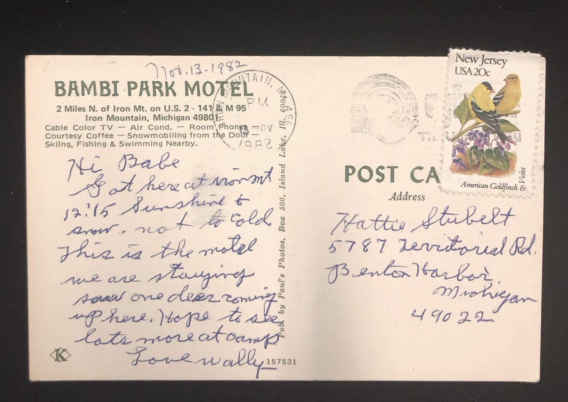 Back information: Bambi Park Motel. 2 Miles N. of Iron Mt. on U.S. 2-141 & M 95 Iron Mountain, Michigan 49801 Cable Color TV-Air Cond.-Room Phones- Courtesy Coffee- Snowmobiling from the Door- skiing, fishing, & Swimming nearby.