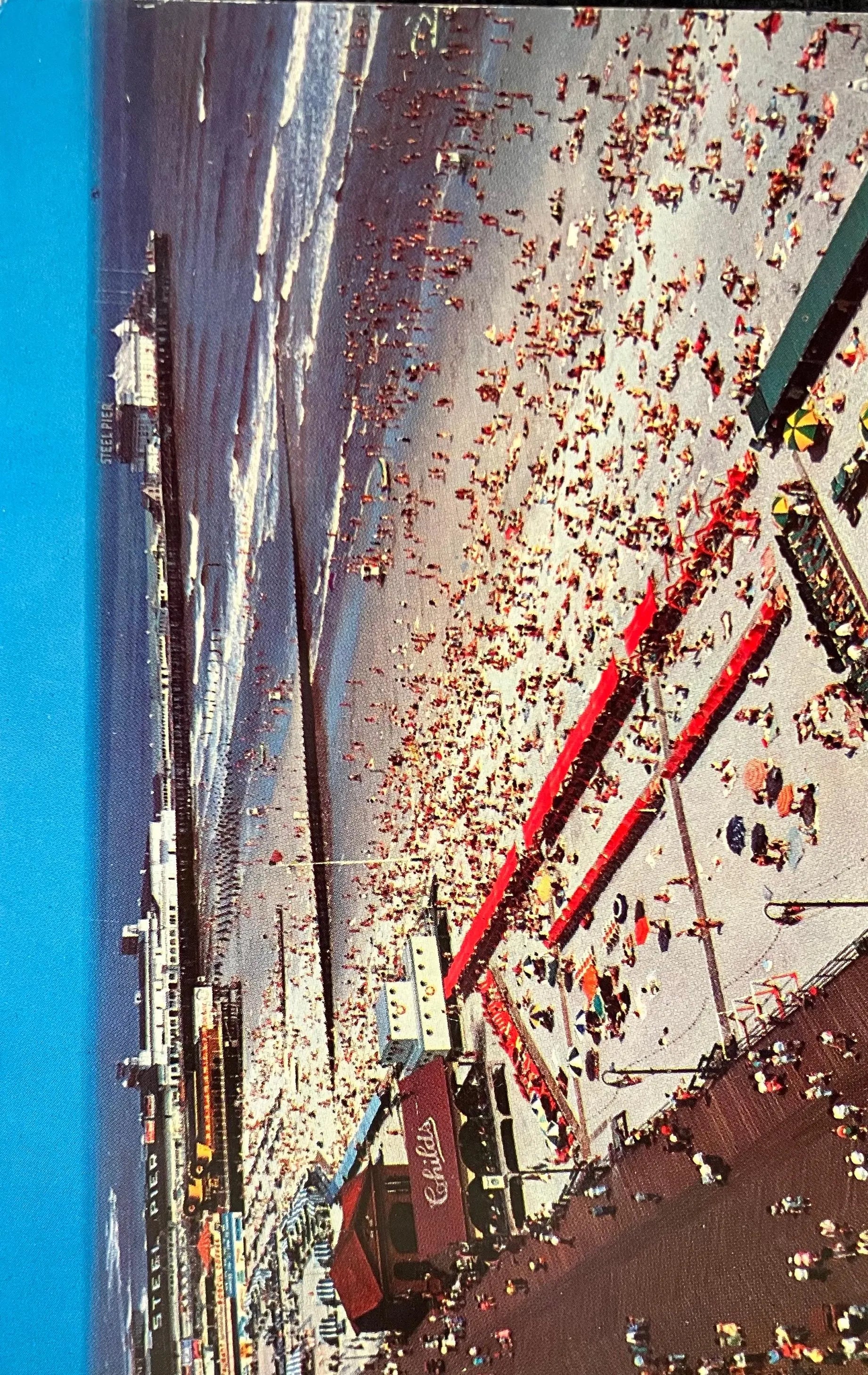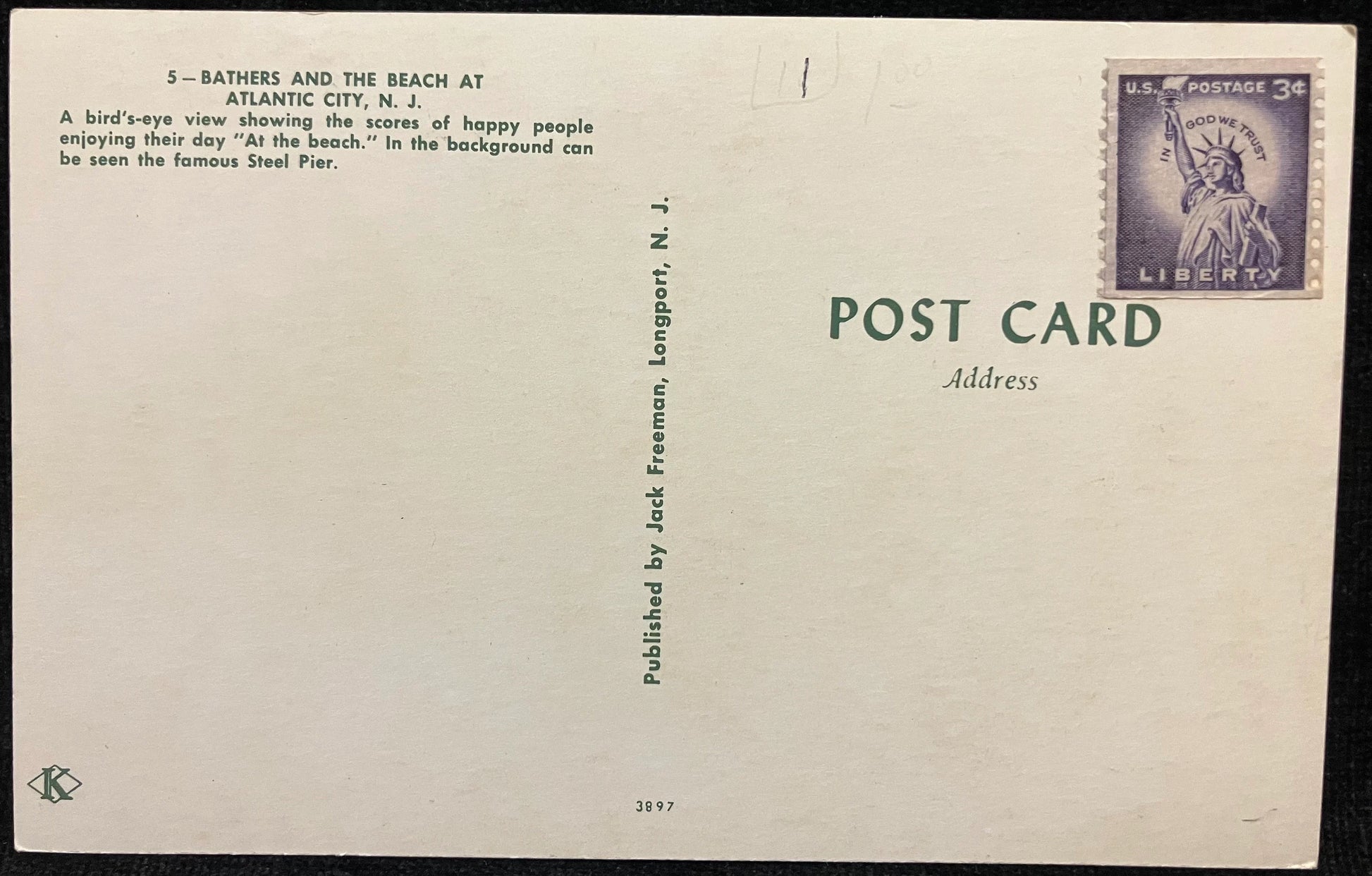 Back: BATHERS AND THE BEACH AT ATLANTIC CITY, N. J. A bird's-eye view showing the scores of happy people enjoying their day "At the beach." In the background can