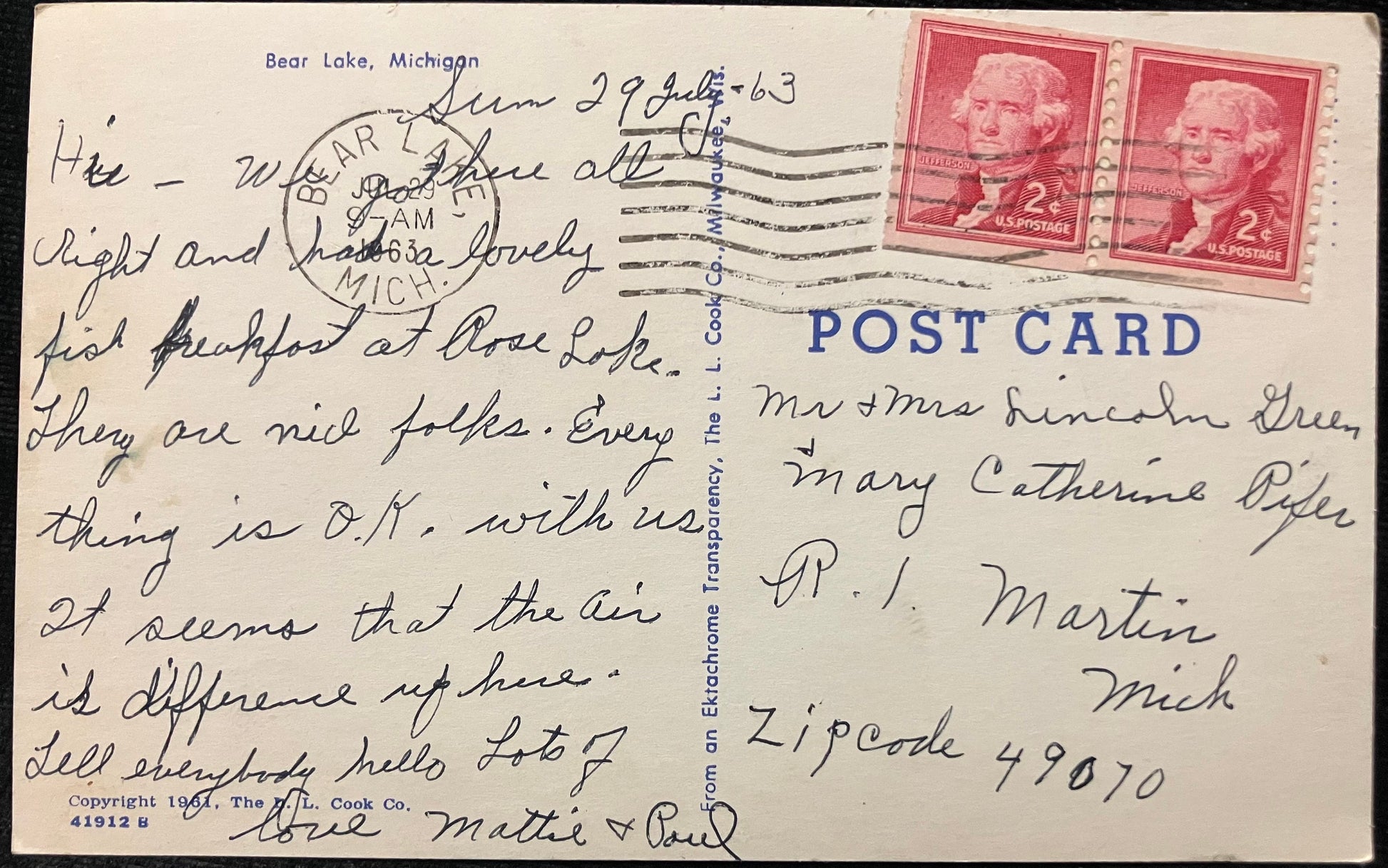 Mailed: Postmark on July 29, 1963 from Bear Lake, Michigan with two red George Washington two cent stamps