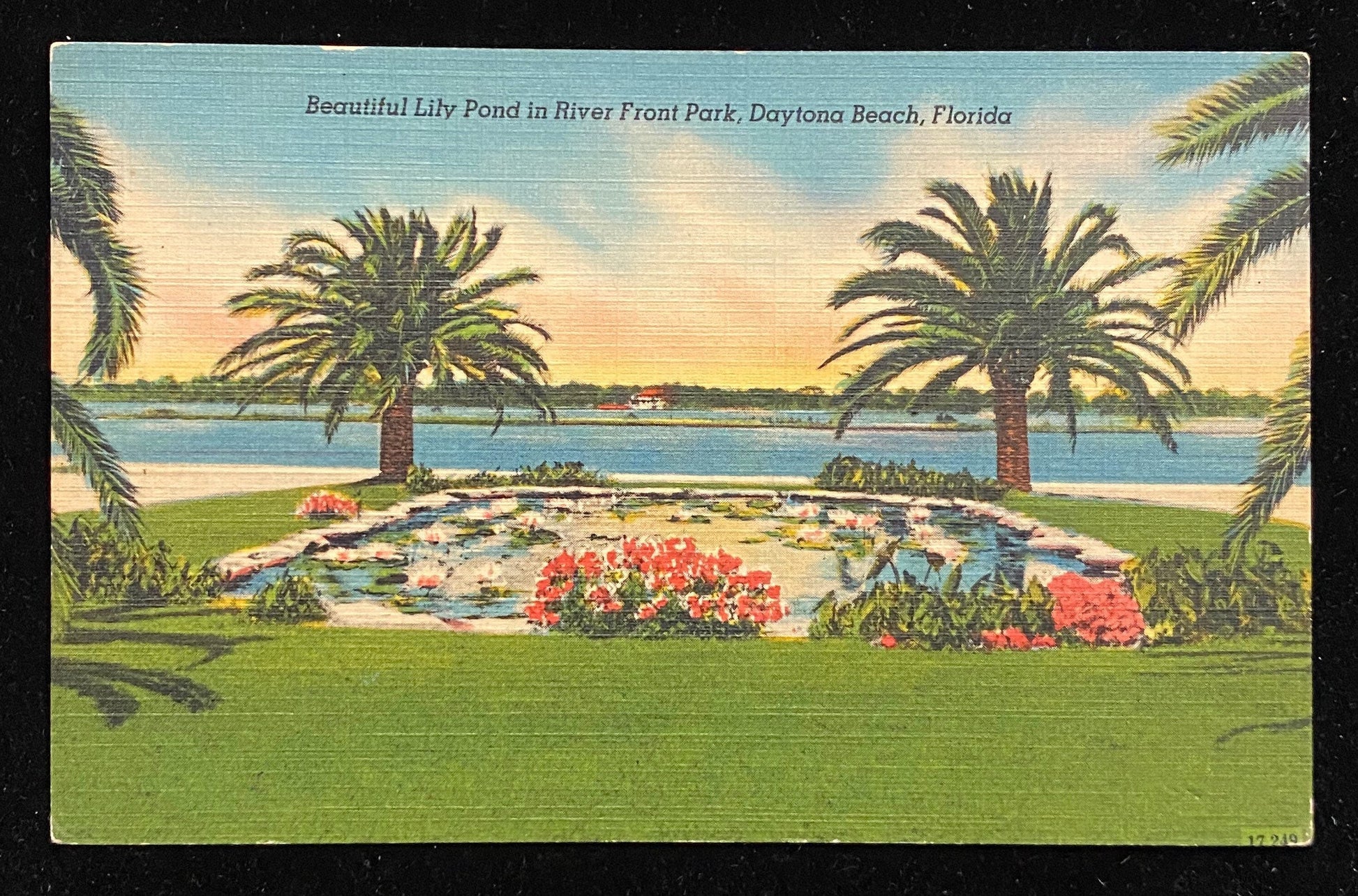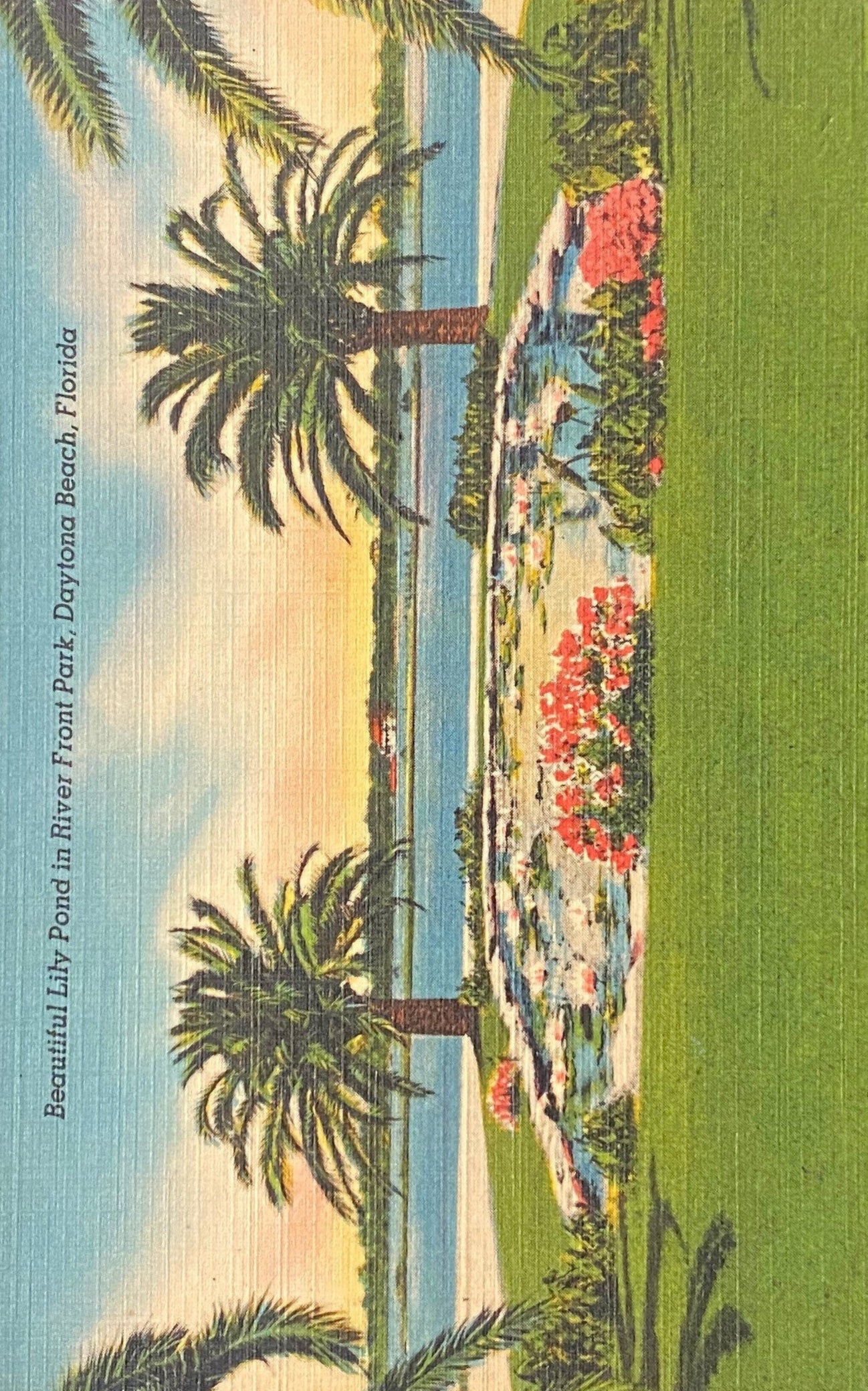 Beautiful Lily Pond in River Front Park, Daytona Beach, Florida - 1940s Linen Postcard