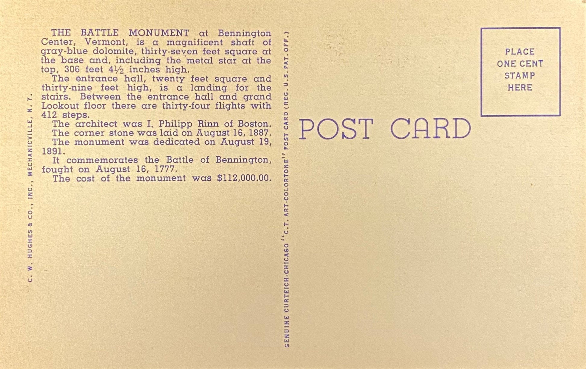 Back Text: "The Battle Monument at Bennington Center, Vermont, is a magnificent shaft of gray-blue dolomite, thirty-seven feet square at the base and, including the metal star at the top, 306 feet 4 1/2 inches high. The entrance hall, twenty feet square and thirty-nine feet high, is a landing for the stairs. Between the entrance hall and grand Lookout floor there are thirty-four flights with 412 steps. The architect was I. Phillip Rinn of Boston. The corner stone was laid on August 19, 1891. It commemorates the Battle of Bennington, fought on August 16, 1777. The cost of the monument was $112,000.00. The highest Battle Monument in the world."