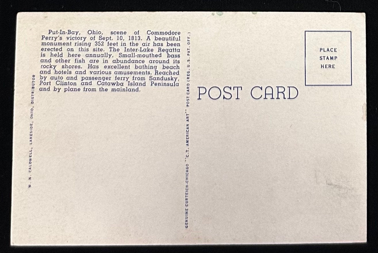 Back Information: Put-In-Bay, Ohio, scene of Commodore Perry's victory of Sept. 10, 1813. A beautiful monument rising 352 feet in the air has been erected on this site. The Inter-Lake Regatta is held here annually. Small-mouthed bass and other fish are in abundance around its rocky shores. Has an excellent bathing beach and hotels, and various amusements. Reached by auto and passenger ferry from Sandusky, Port Clinton, and Catawba Island Peninsula, and by plane from the mainland.