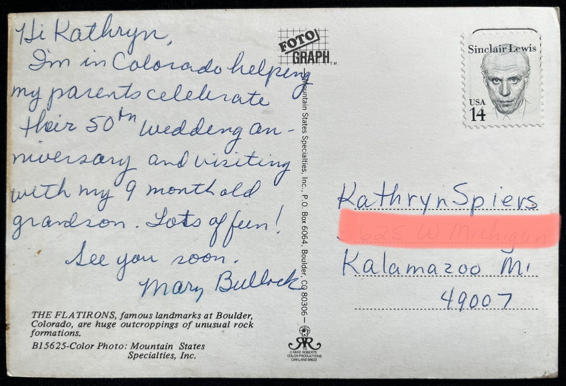 Mailed, with writing and 14-cent Sinclair Lewis stamp on the back
