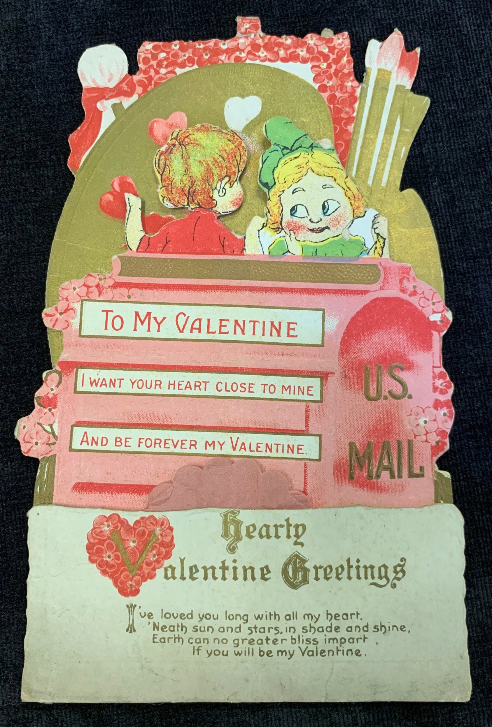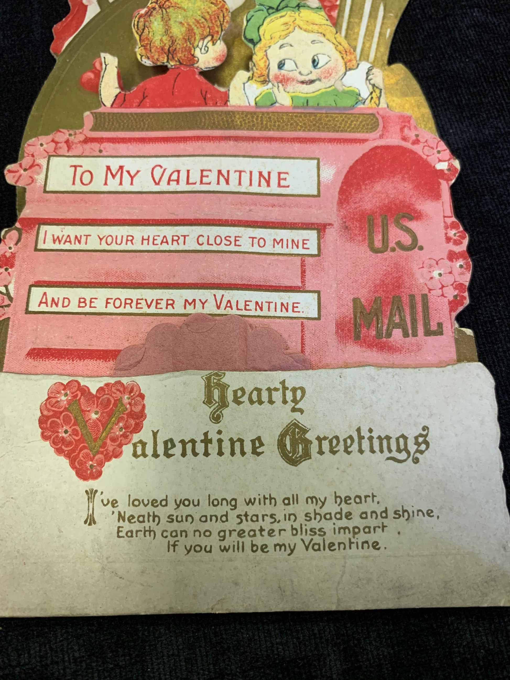 "U.S. Mail" on the front and "Hearty Valentine Greetings - I've loved you long with all my heart. 'Neath sun and stars, in shade and shine, Earth can no greater bliss impart. If you will be my Valentine" on the bottom when the card is folded down. The card is in great condition being 90 years old!