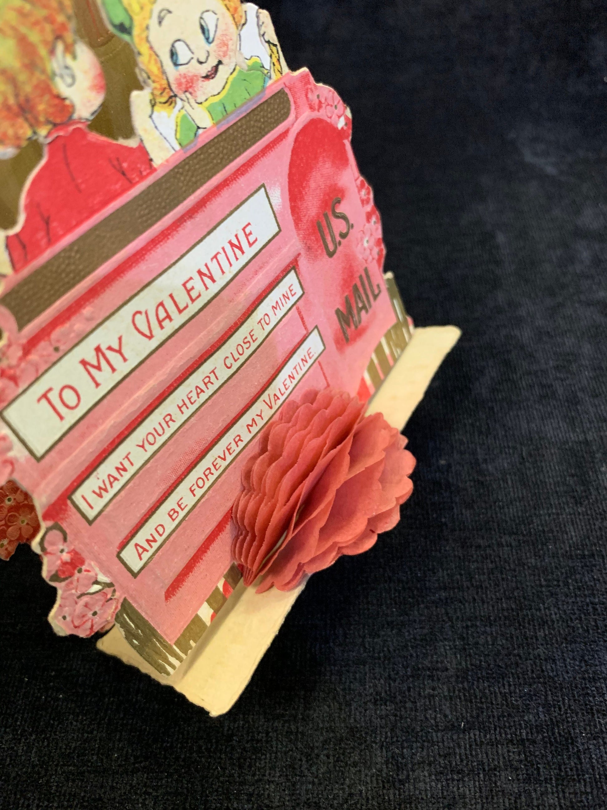 Boy and Girl in Mailbox Honeycomb Front Fold Out Valentine made in the early 30's. The card has small text that reads: "To my Valentine. I want your Heart Close to Mine. And be Forever my Valentine."