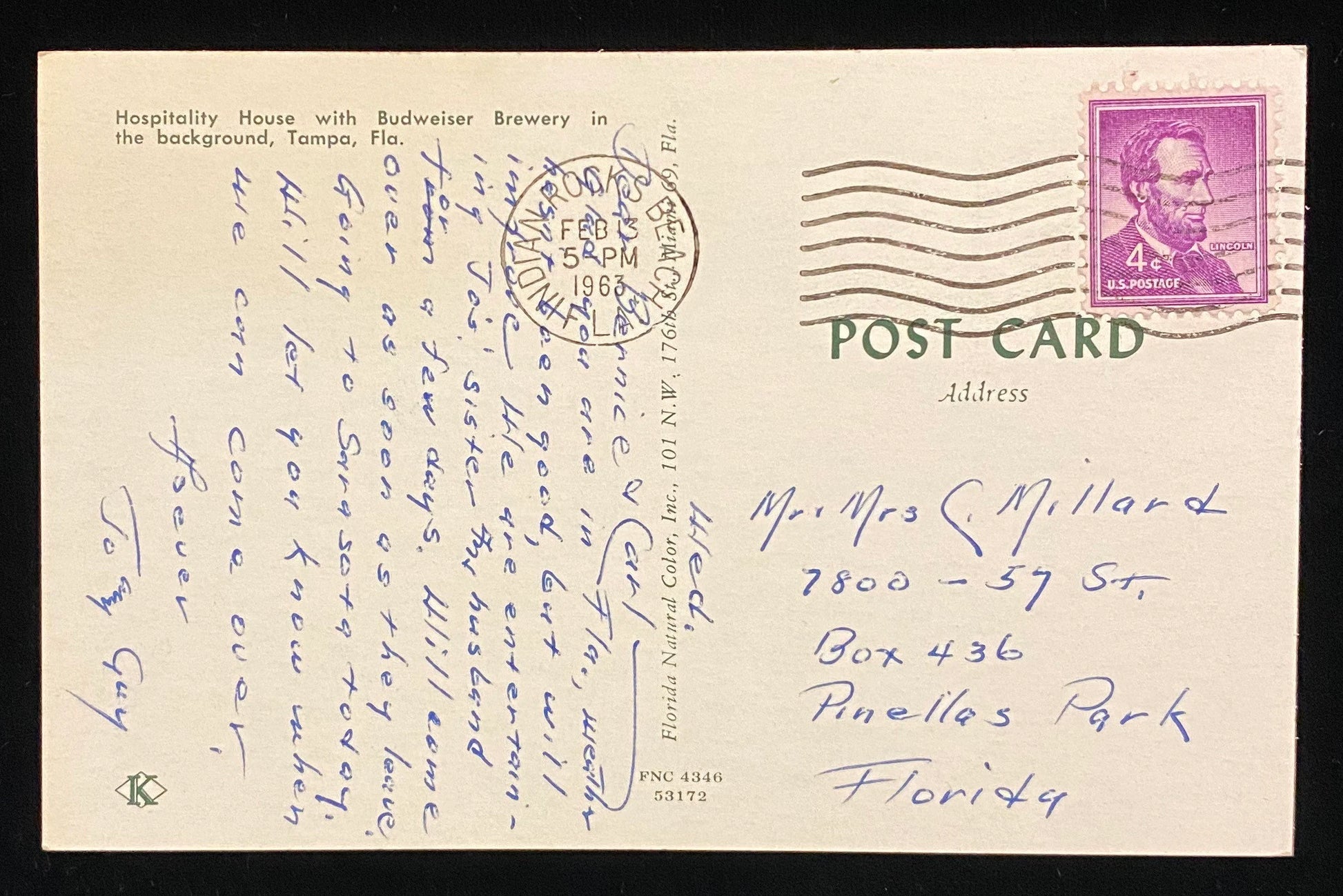 Back Information: "Hospitality House with Budweiser Brewery in the background, Tampa, Fla."