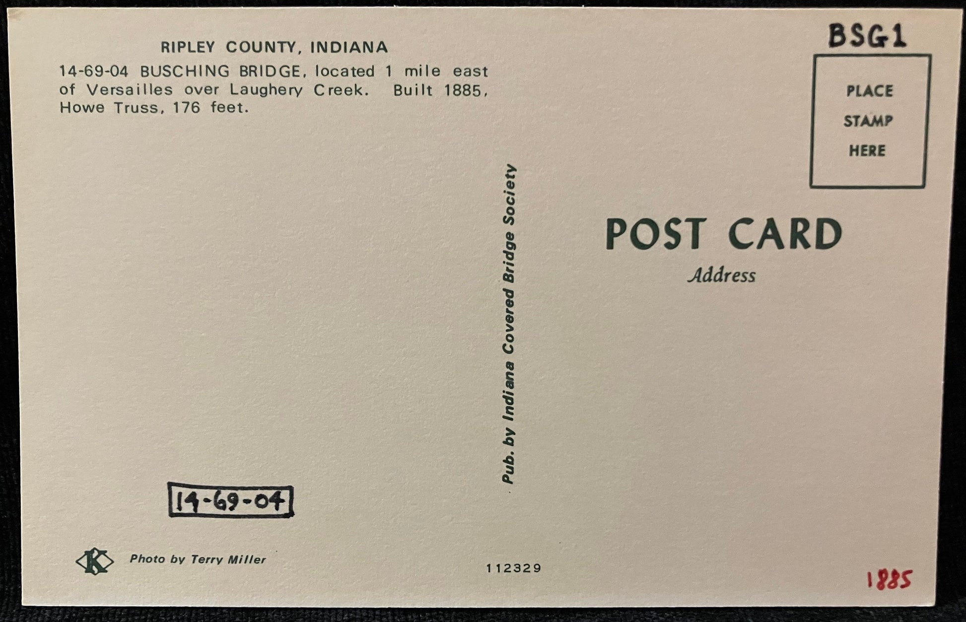 On front: Busching Coverd Bridge in Ripley County, Indiana