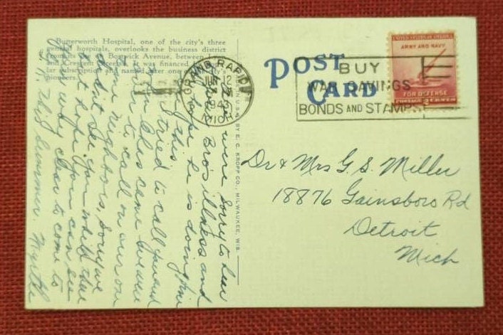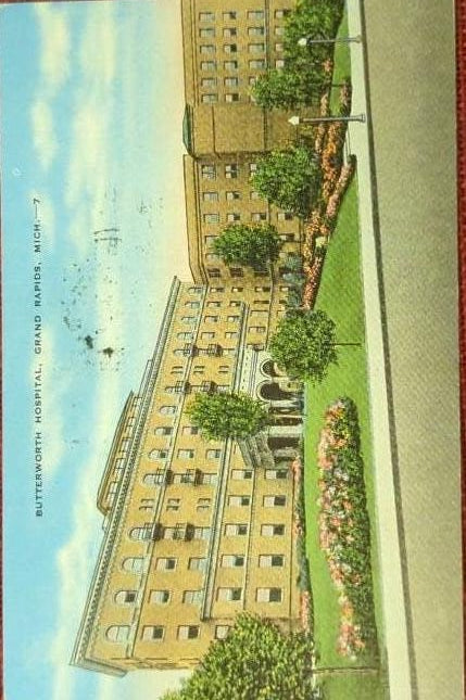 Butterworth Hospital was one of Grand Rapids three general hospitals in the 40's, and overlooked the business district. It was named after one of the cities pioneers. This card was mailed in 1943. The card is in good condition.
