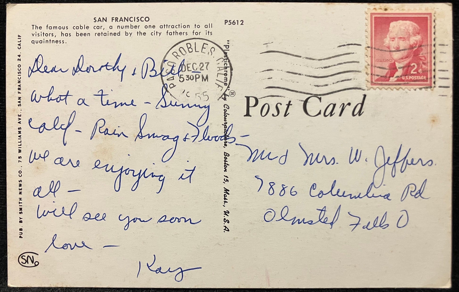 Mailed: Postmark on December 27, 1955 from Pasco Robles, California with a red two cent Thomas Jefferson stamp