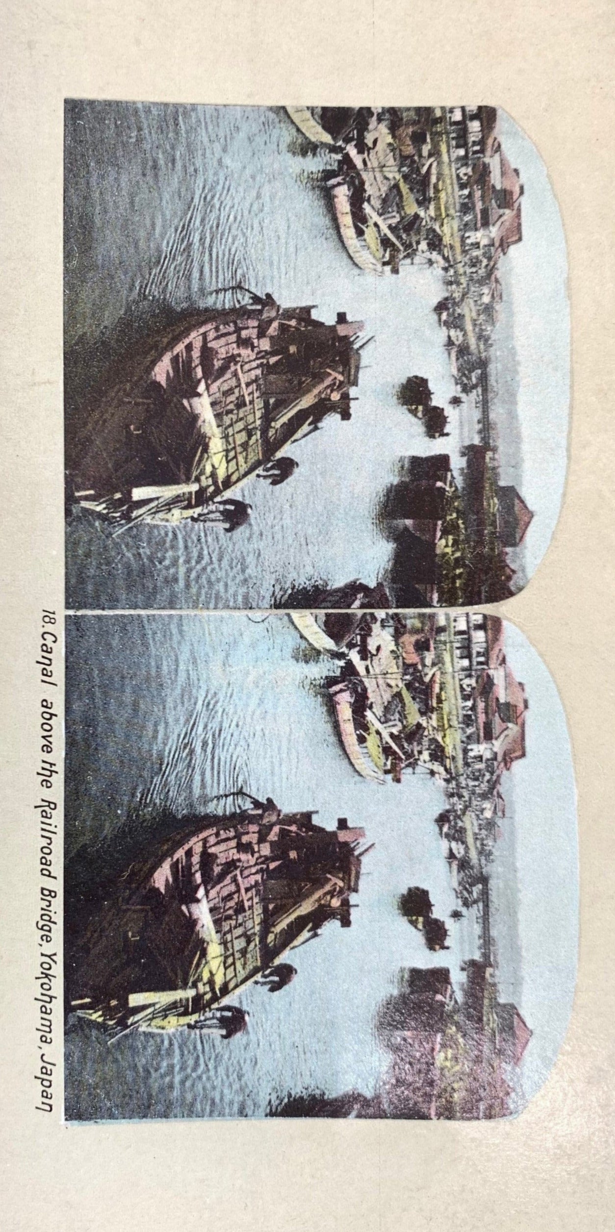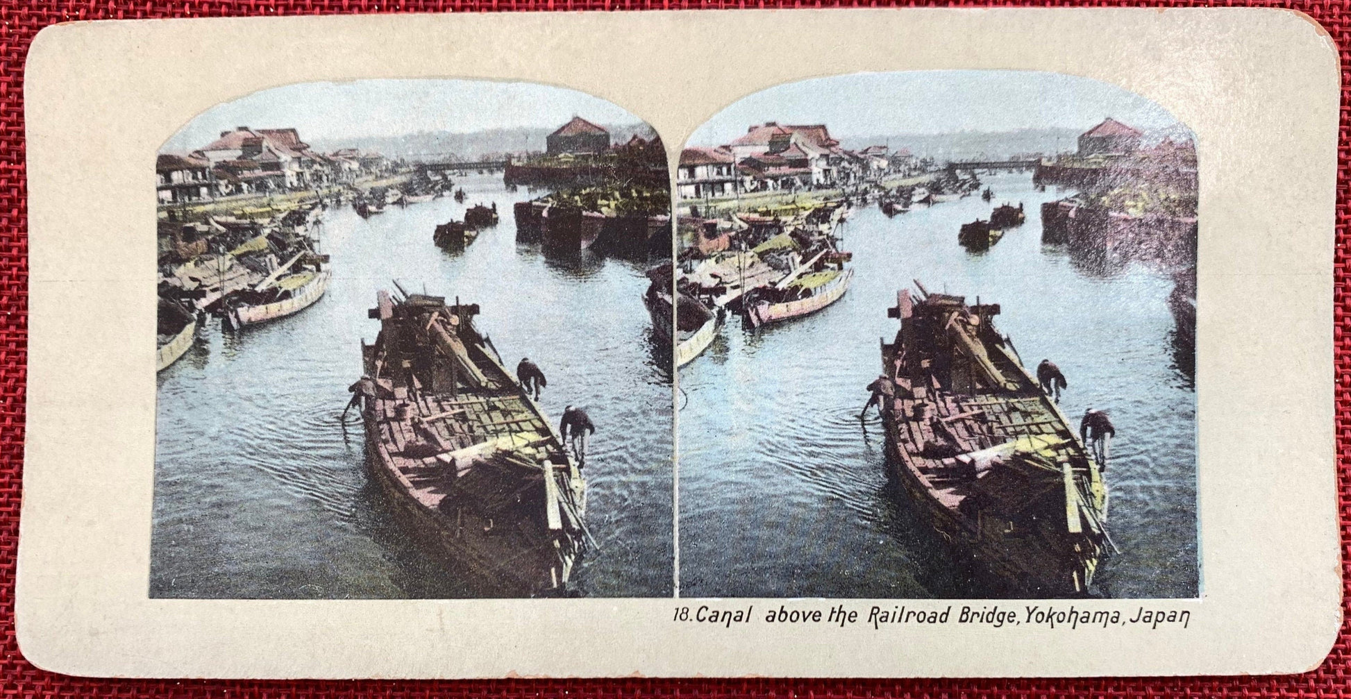 This vintage stereo card features two hand tinted photographs of the canal above the Railroad Bridge in Yokohama, Japan. This card dates from the 1890s.