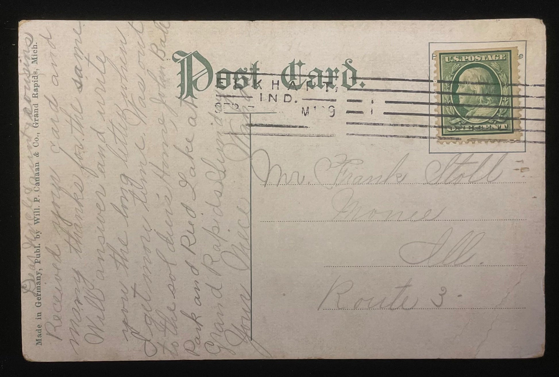 Mailed. Green 1 cent Franklin stamp