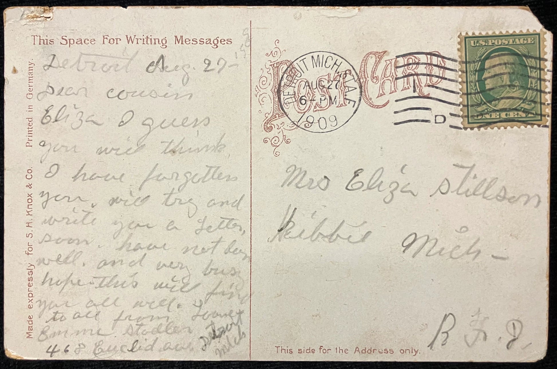 Mailed: Postmark on Aug 27, 1909, from Detroit, Mich., with a green one-cent Ben Franklin