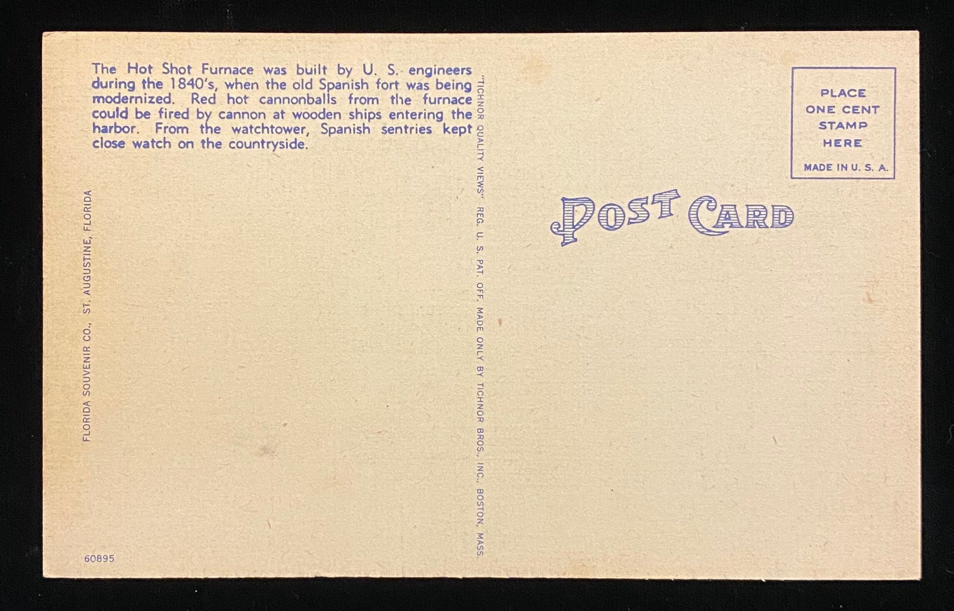 Back Information: "The Hot Shot Furnace was built by U.S. engineers during the 1840's when the old Spanish fort was being modernized. Red hot cannonballs from the furnace could be fired by cannon at wooden ships entering the harbor. From the watchtower, Spanish sentries kept close watch on the countryside."