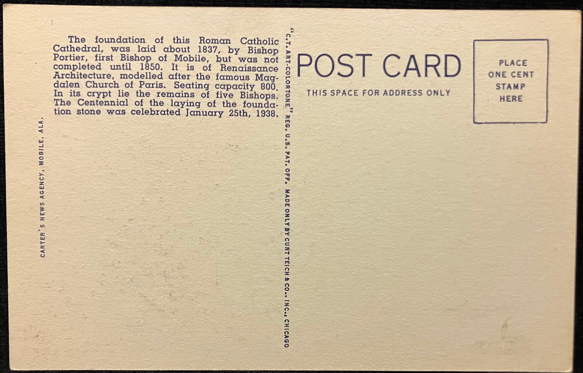 On back: The foundation of this Roman Catholic Cathedral, was laid about 1837, by Bishop Portier, first Bishop of Mobile, but was not completed until 1850. It is of Renaissance Architecture, modeled after the famous Magdalen Church of Paris. Seating capacity 800. In its crypt lie the remains o five Bishops. The Centennial of the laying of the foundation stone was celebrated January 25th, 1938
