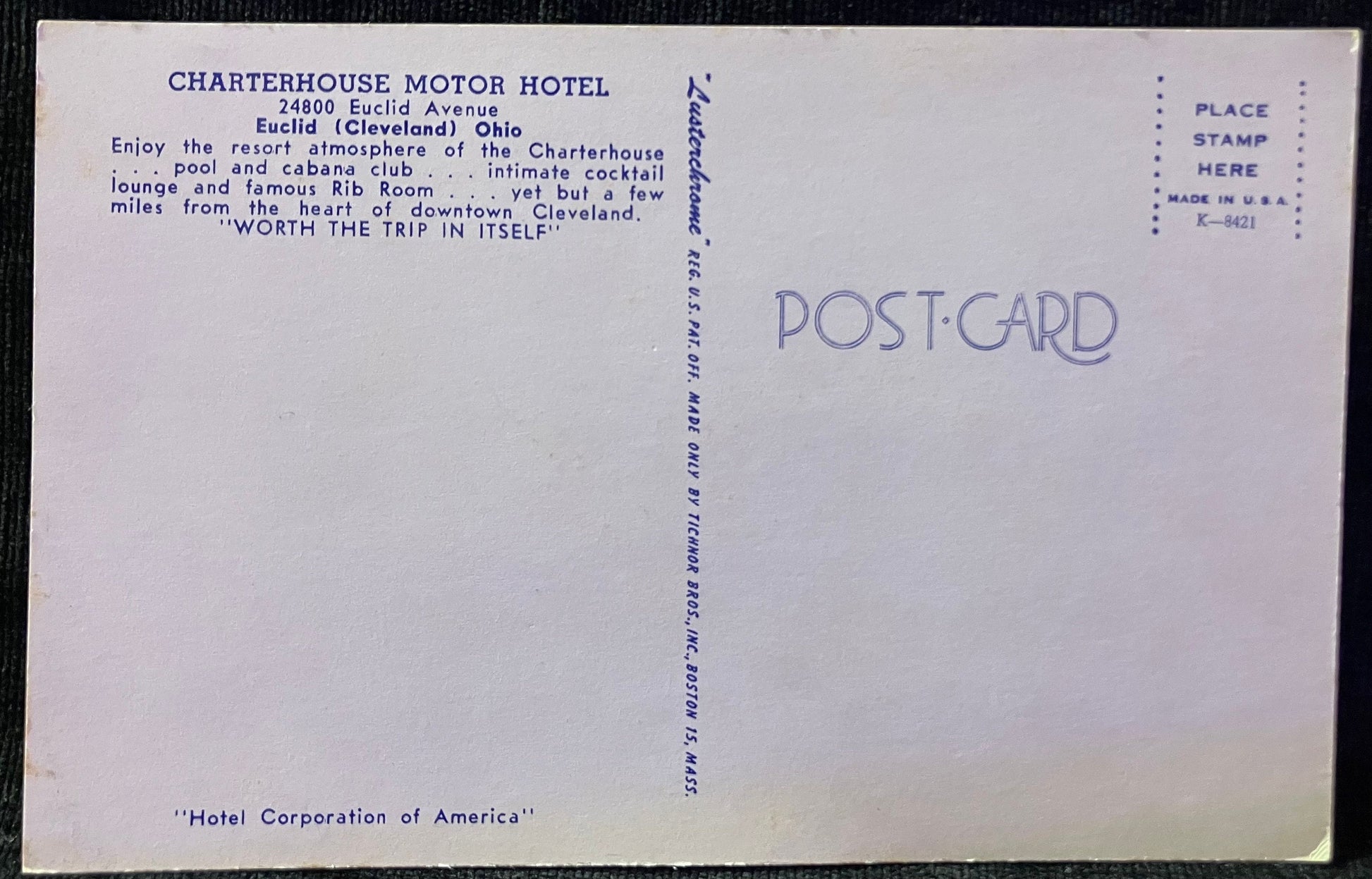 On back: CHARTERHOSUE MOTOR HOTEL 24800 Euclid Avenue Euclid (Cleveland) Ohio. Enjoy the resort atmosphere of the Charterhouse… pool and cabana club… intimate cocktail lounge and famous Rib Room… yet but a few miles from the heart of downtown Cleveland. “WORTH THE TRIP IN ITSELF”
