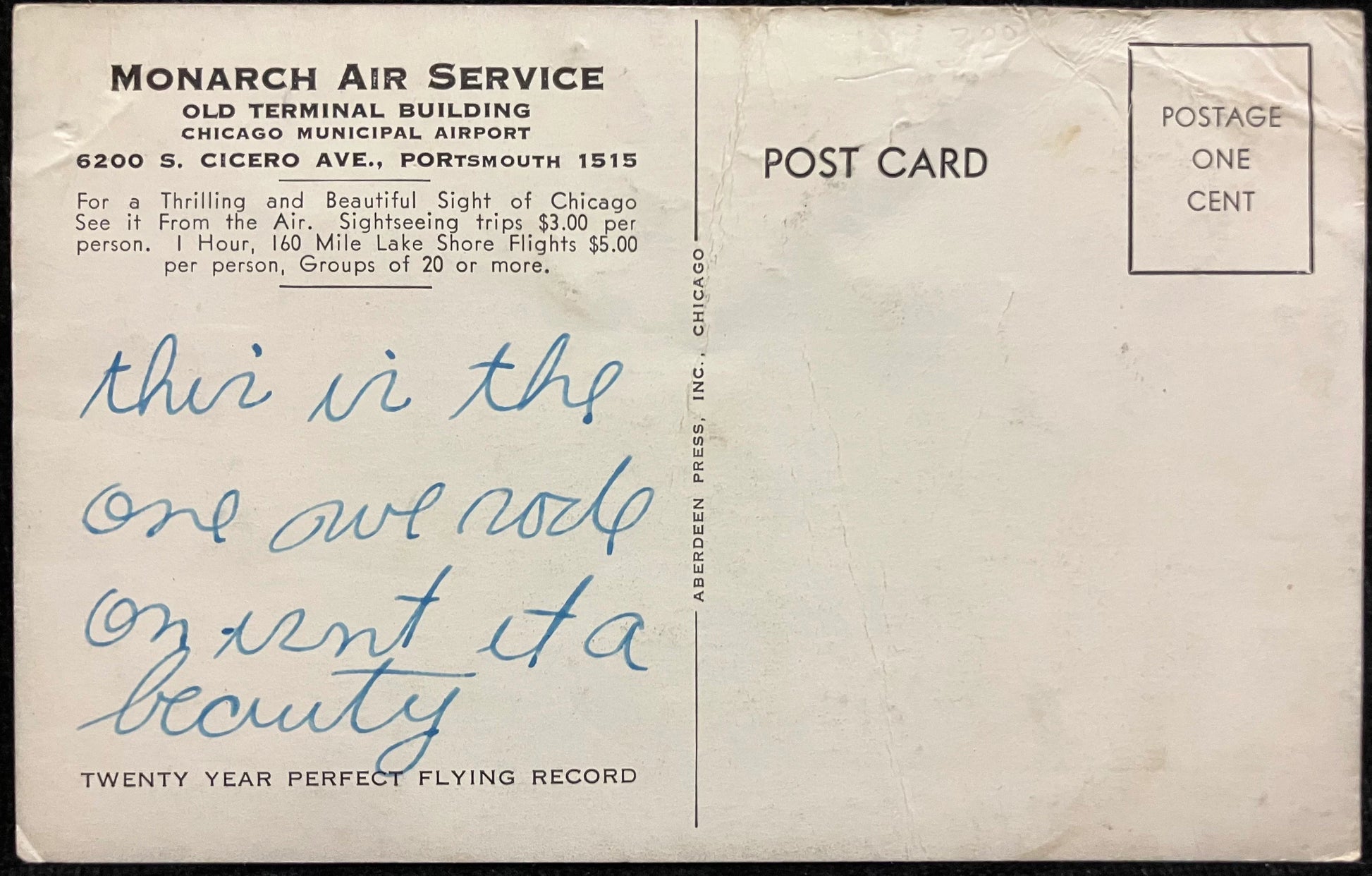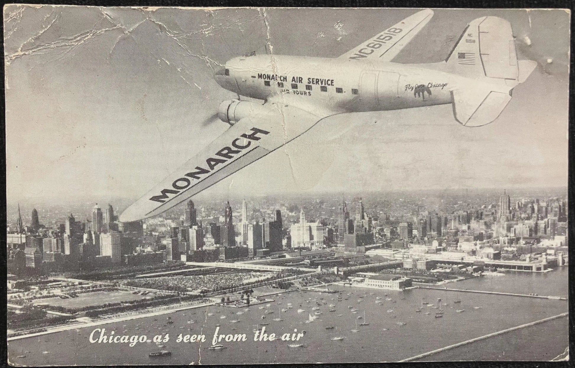 On back: MONARCH AIR SERVICE Old Terminal Building Chicago Municipal Airport 6200 S. Cicero Ave., Portsmouth 1515 For a Thrilling and Beautiful Sight of Chicago See it From the Air. Sightseeing trips $3.00 per person. 1 Hour, 160 Mile Lake Shore Flights $5.00 per person, Groups of 20 or more.