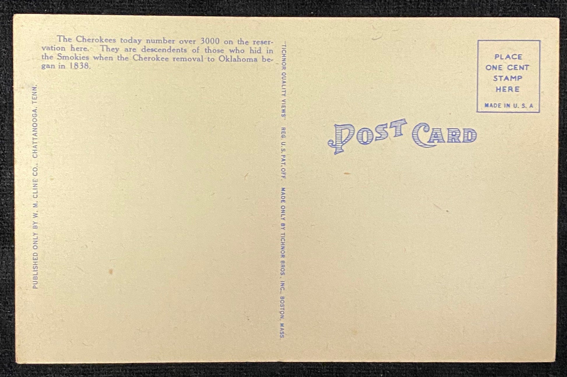 Back: "The Cherokees today number over 3000 on the reservation here. They are descendants of those who hid in the Smokies when the Cherokee removal to Oklahoma began in 1838."